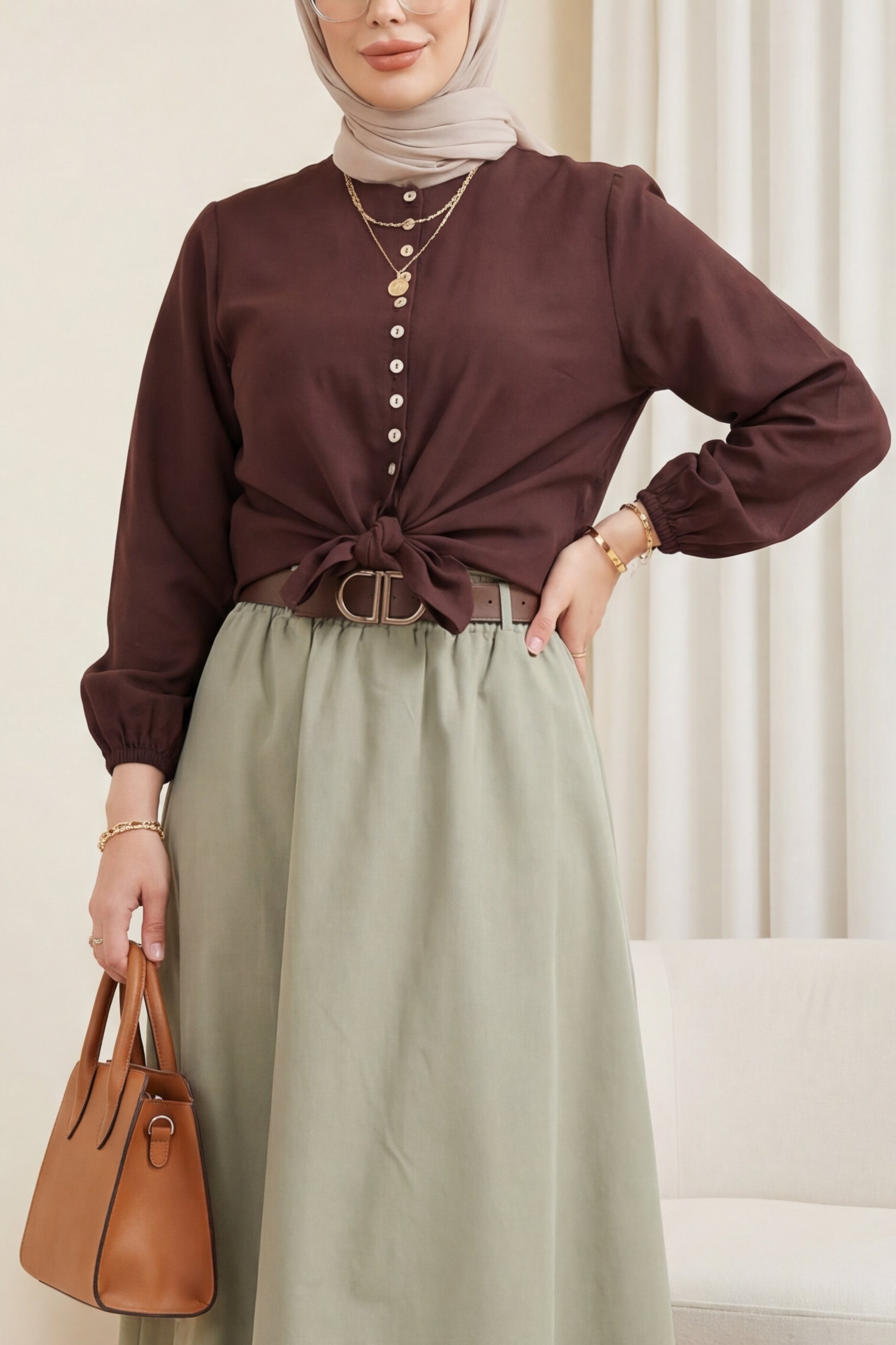 Kombindeki şal, çanta, ayakkabı ve takılar aksesuar olarak kullanılmıştır.