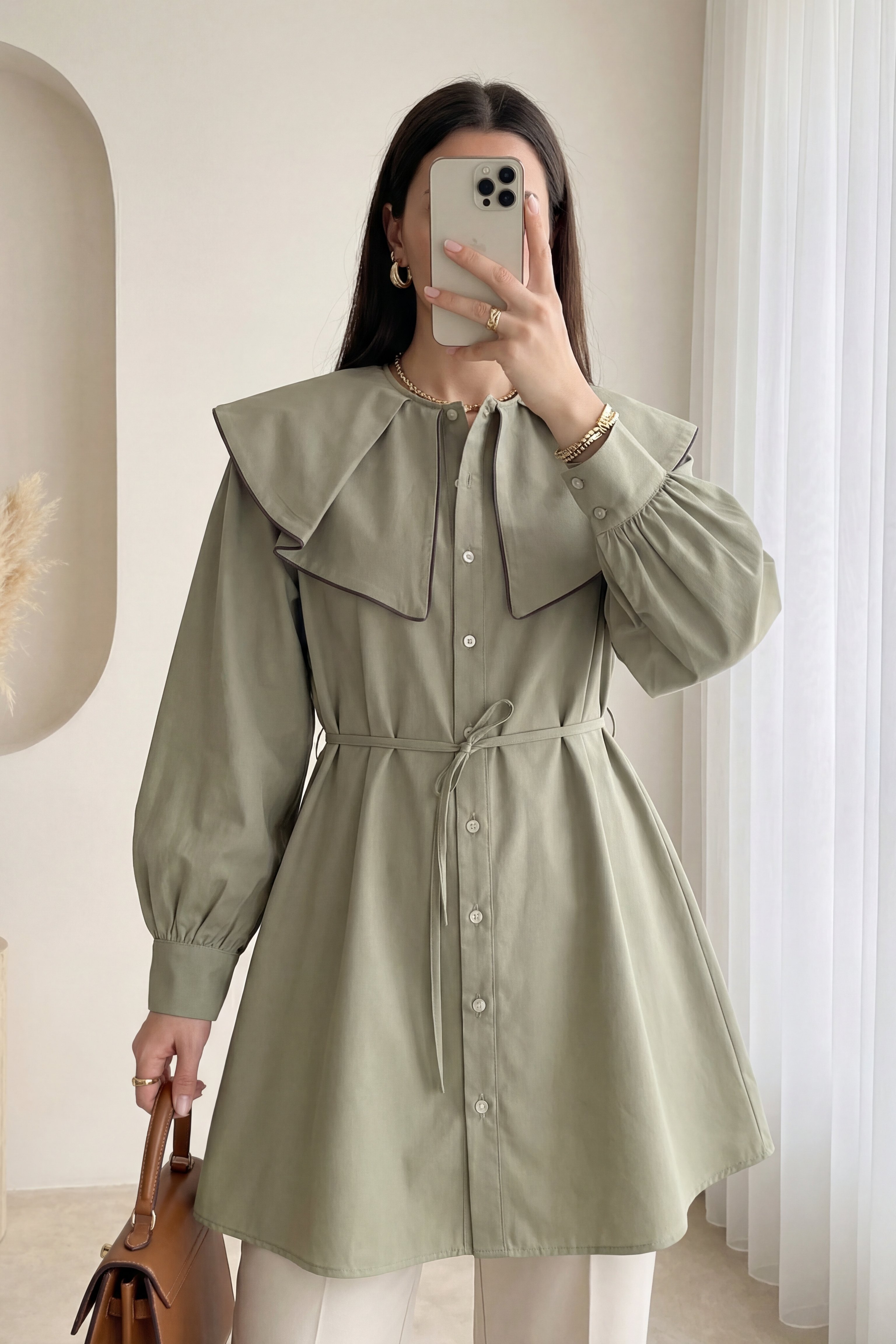 “Geniş yakalı gömlek”, “kemerli düğmeli gömlek”, “kadın gömlek modelleri” gibi adlandırılabilir.