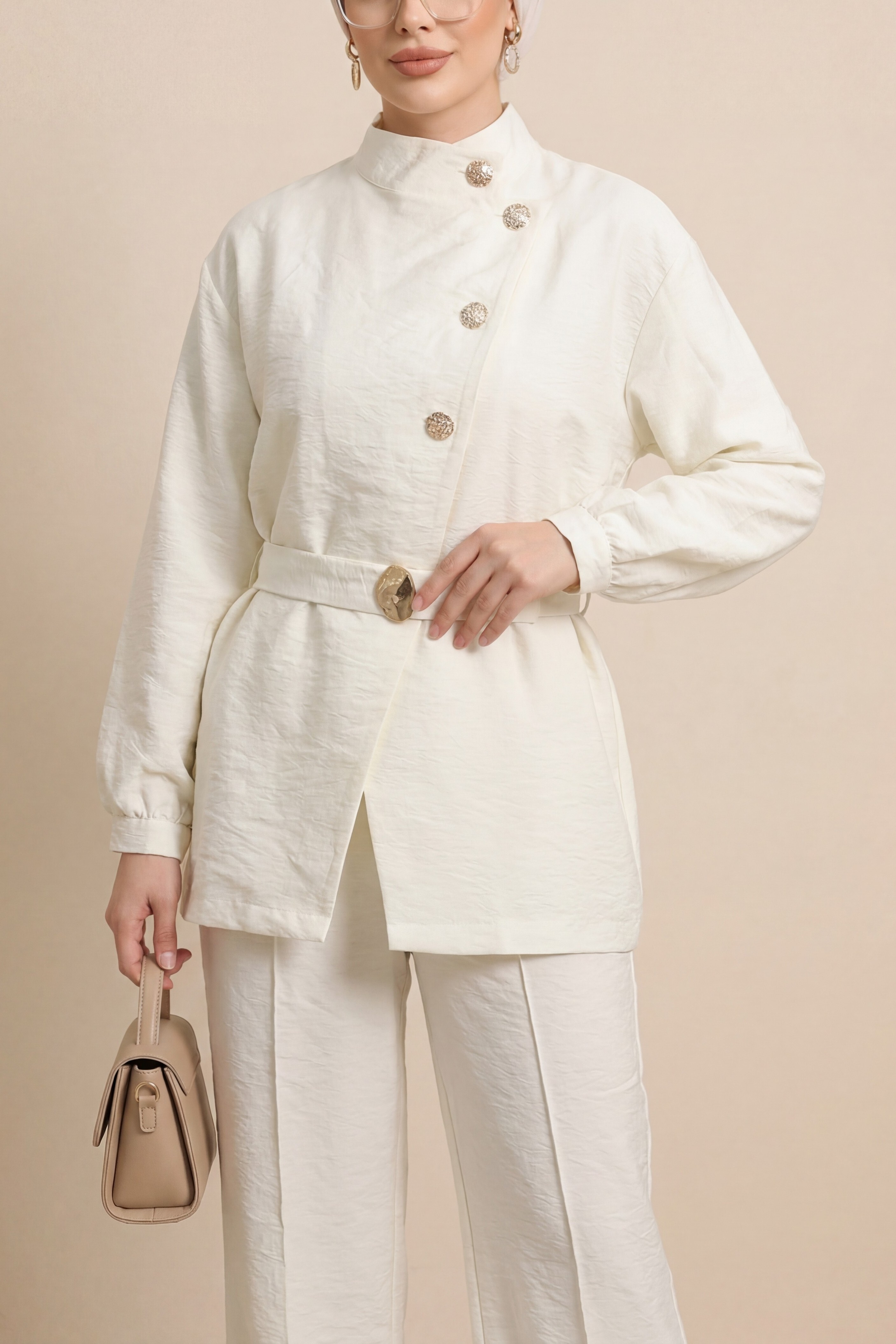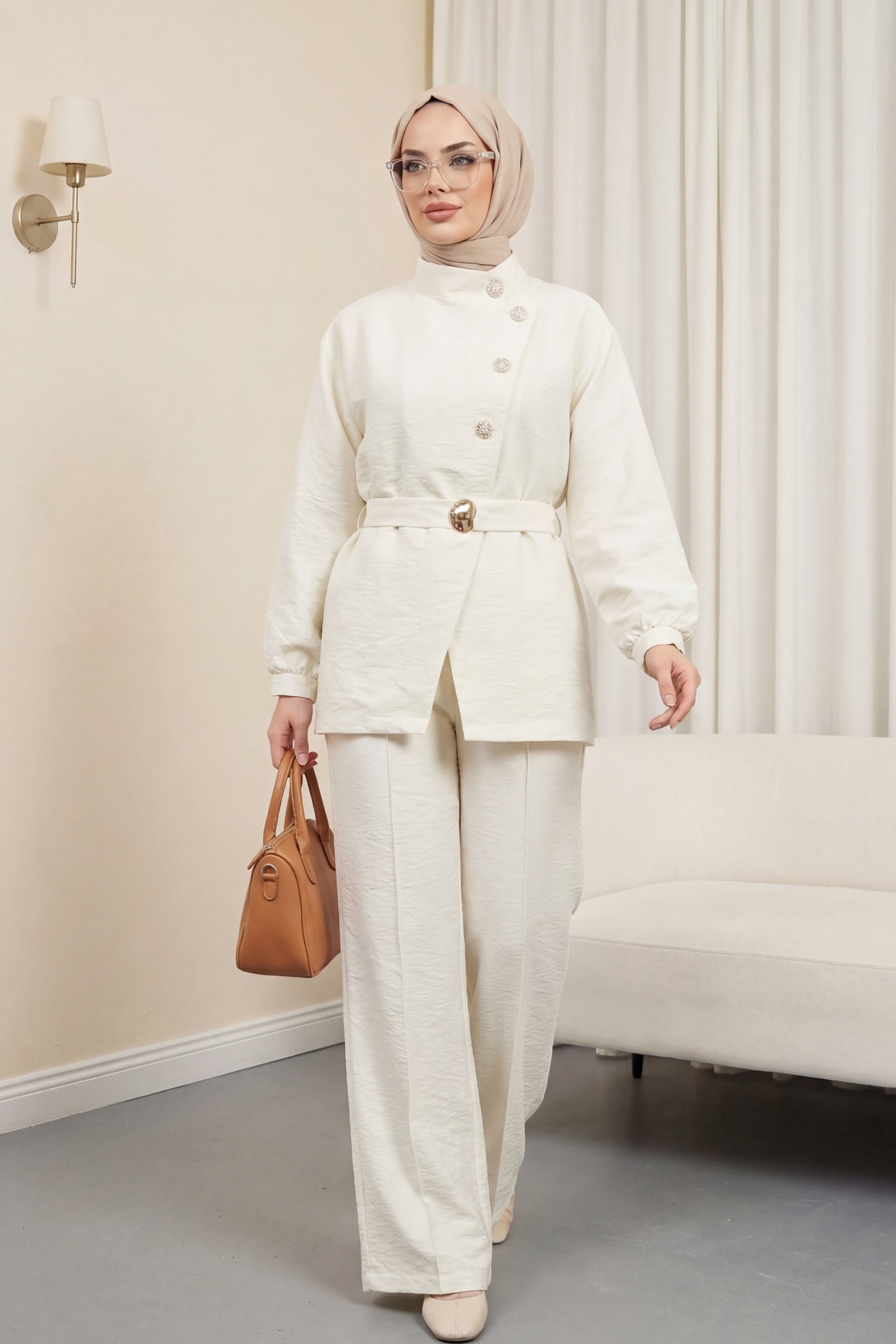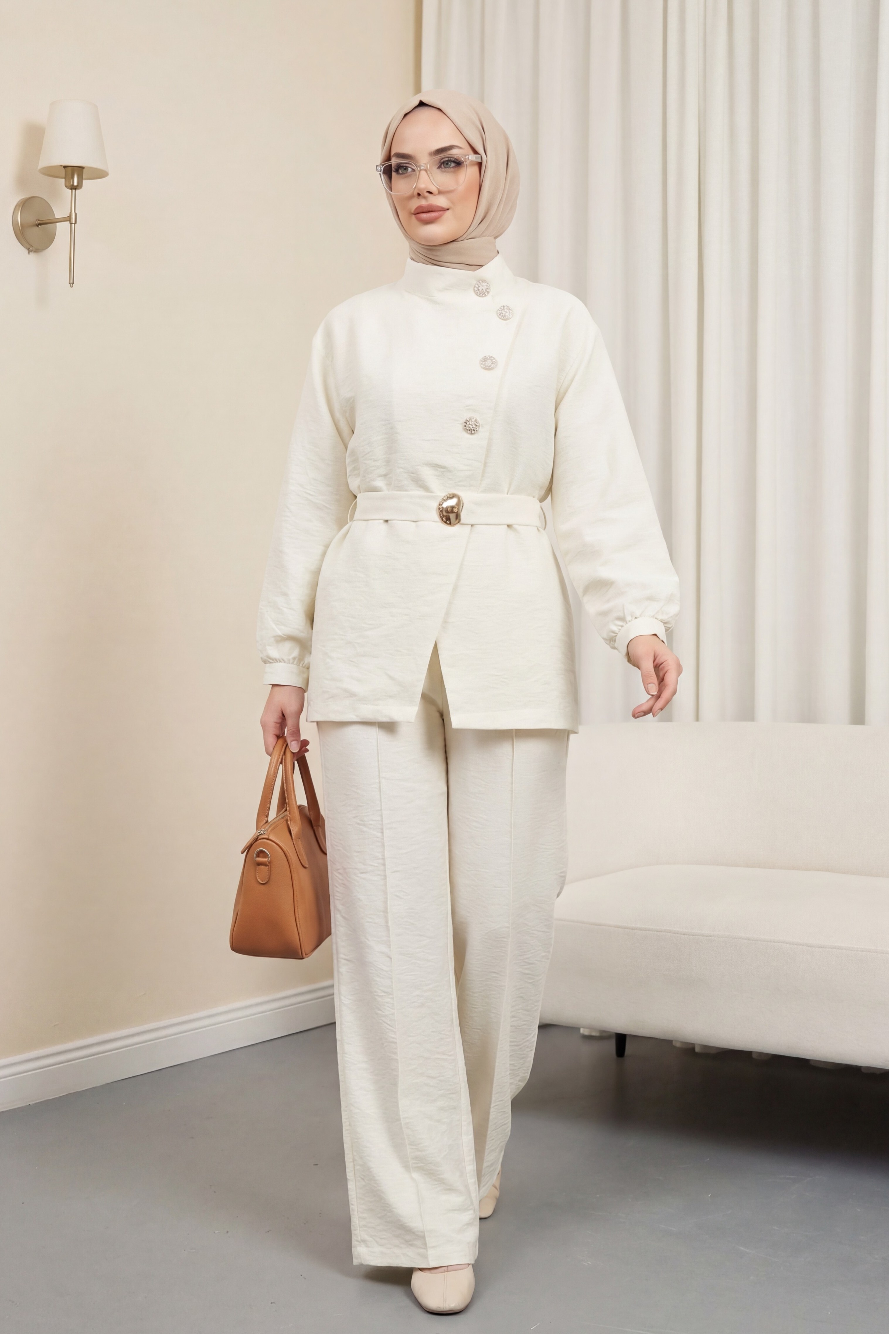 Gold Düğmeli Tokalı Kemerli Fırfır Detaylı Cupra Takım, zarif ve şık bir stil sunar. Gold düğmeler ve tokalı kemer detayı tasarıma dikkat çekici bir dokunuş katarken, fırfır detayları feminen bir görünüm sağlar. Cupra kumaşı akışkan ve rahattır.