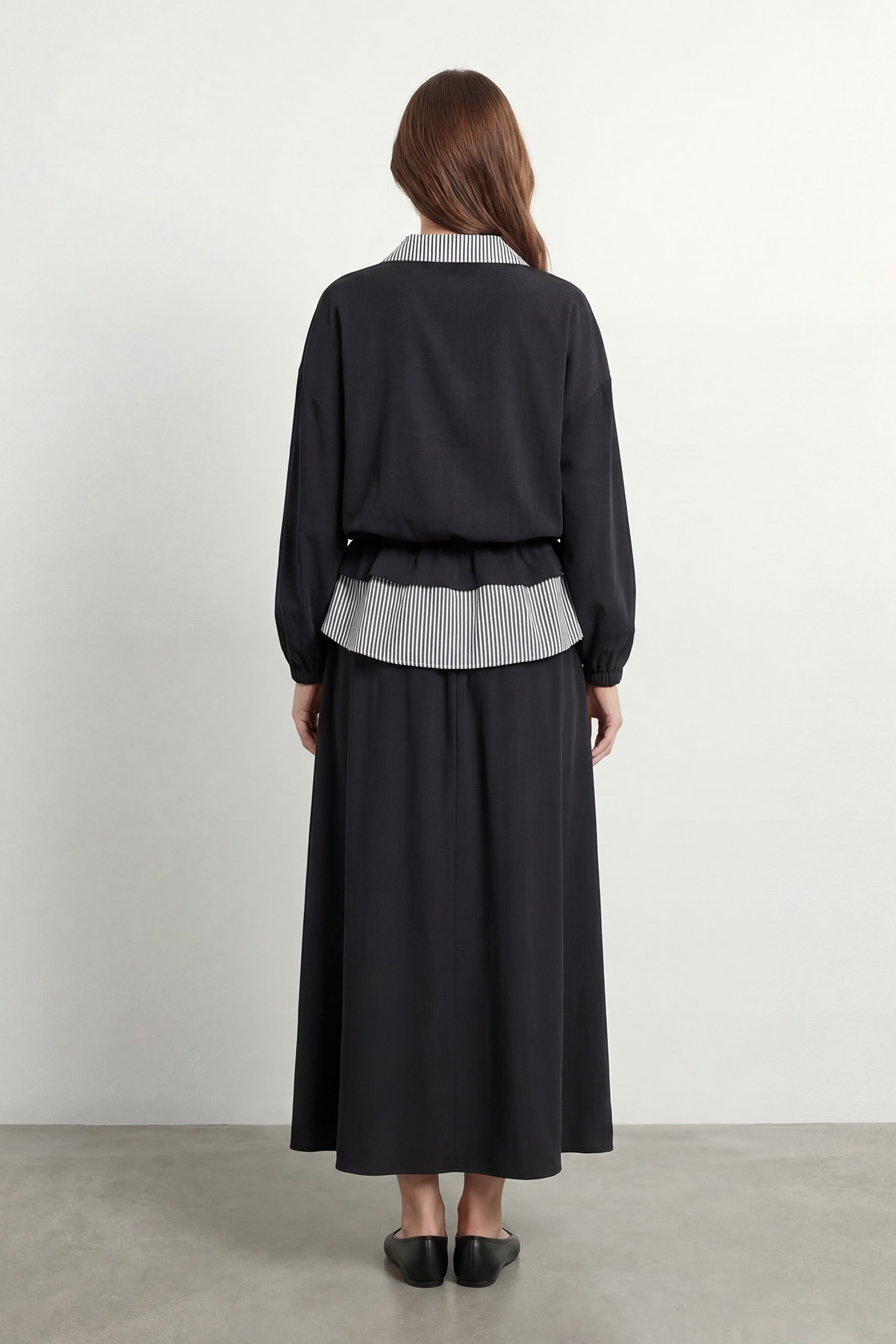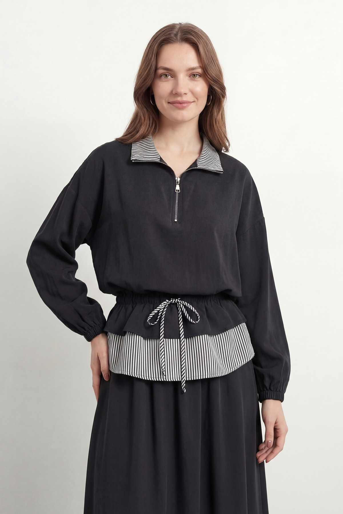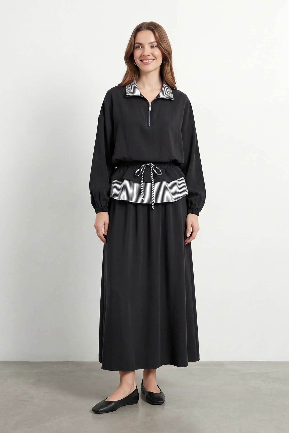 Tasarımıyla fark yaratan Kadın Çizgili Garni Detaylı Takım, yüksek kaliteli %84 Modal ve %16 Polyester karışımlı dokusuyla konforlu bir şıklık sunar. Bel kısmındaki kontrast çizgili garni detayı ve ayarlanabilir büzgüsüyle modern bir siluet çizen bu parça, yarım fermuarlı yaka tasarımıyla sportif bir dokunuş kazanır. Regular kesimi ve dökümlü yapısı sayesinde gün boyu hareket özgürlüğü sağlar. Hem günlük kombinlerinizde hem de şehir stilinizde kullanabileceğiniz bu özgün tasarım, zamansız parçalar arayanlar için idealdir.