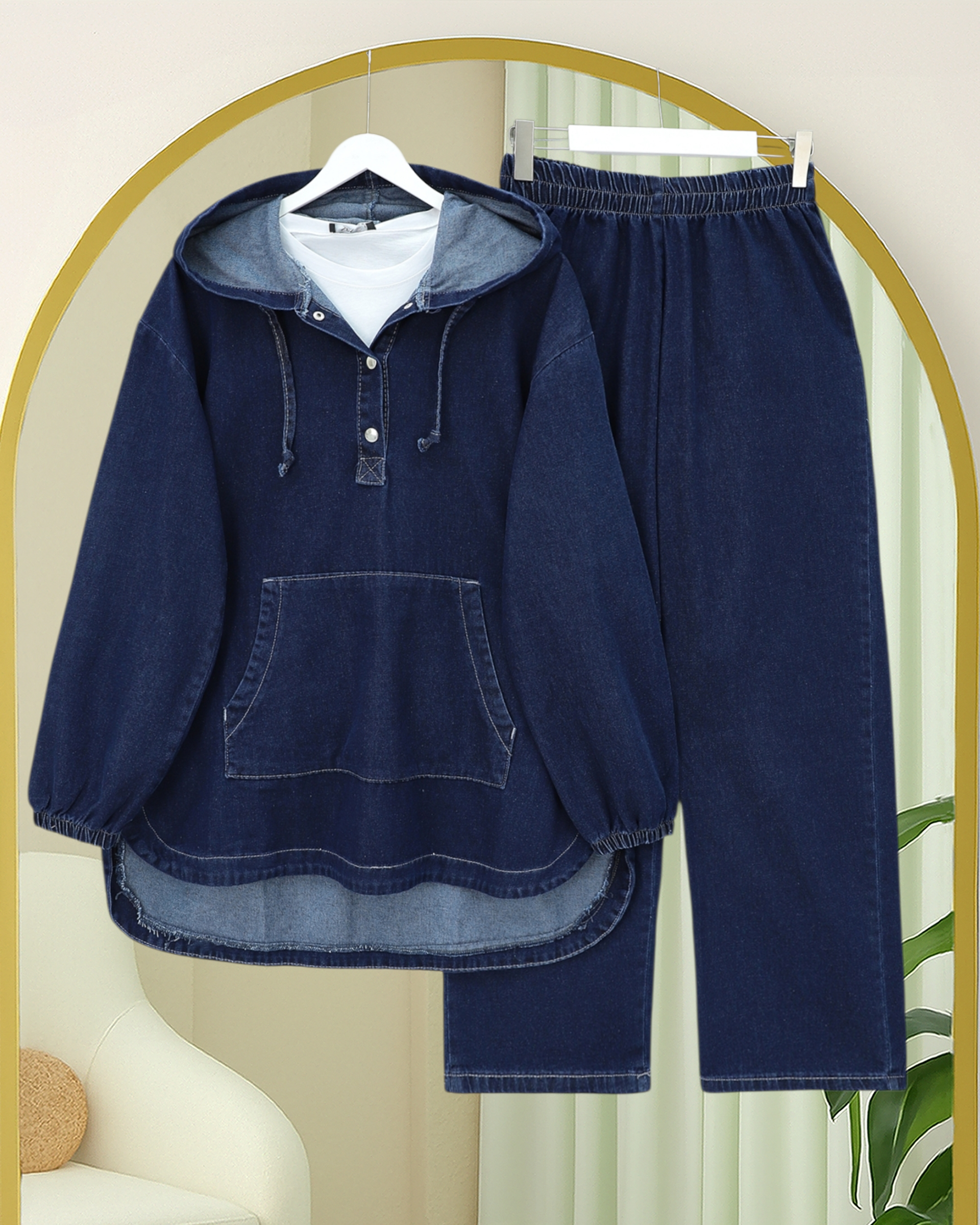 Spor ve trend detayları bir araya getiren Kanguru Cepli Kapşonlu Önü Çıtçıtlı Kot Takım, günlük kombinlere enerjik bir dokunuş katıyor! Kapşon tasarımı modern ve rahat bir stil sunarken, kanguru cep detayı hem fonksiyonel hem de dinamik bir görünüm sağlar. Ön kısmındaki çıtçıt detayı ise tasarıma hareket kazandırarak klasik kot takımlardan ayrışır. Pantolonlu takım formu sayesinde zahmetsiz kombin imkânı sunar; şehir stilinden hafta sonu kombinlerine kadar geniş bir kullanım alanına sahiptir. Vücuda oturan fakat sıkmayan ideal kalıbı ile gün boyu konforlu bir kullanım sağlar.