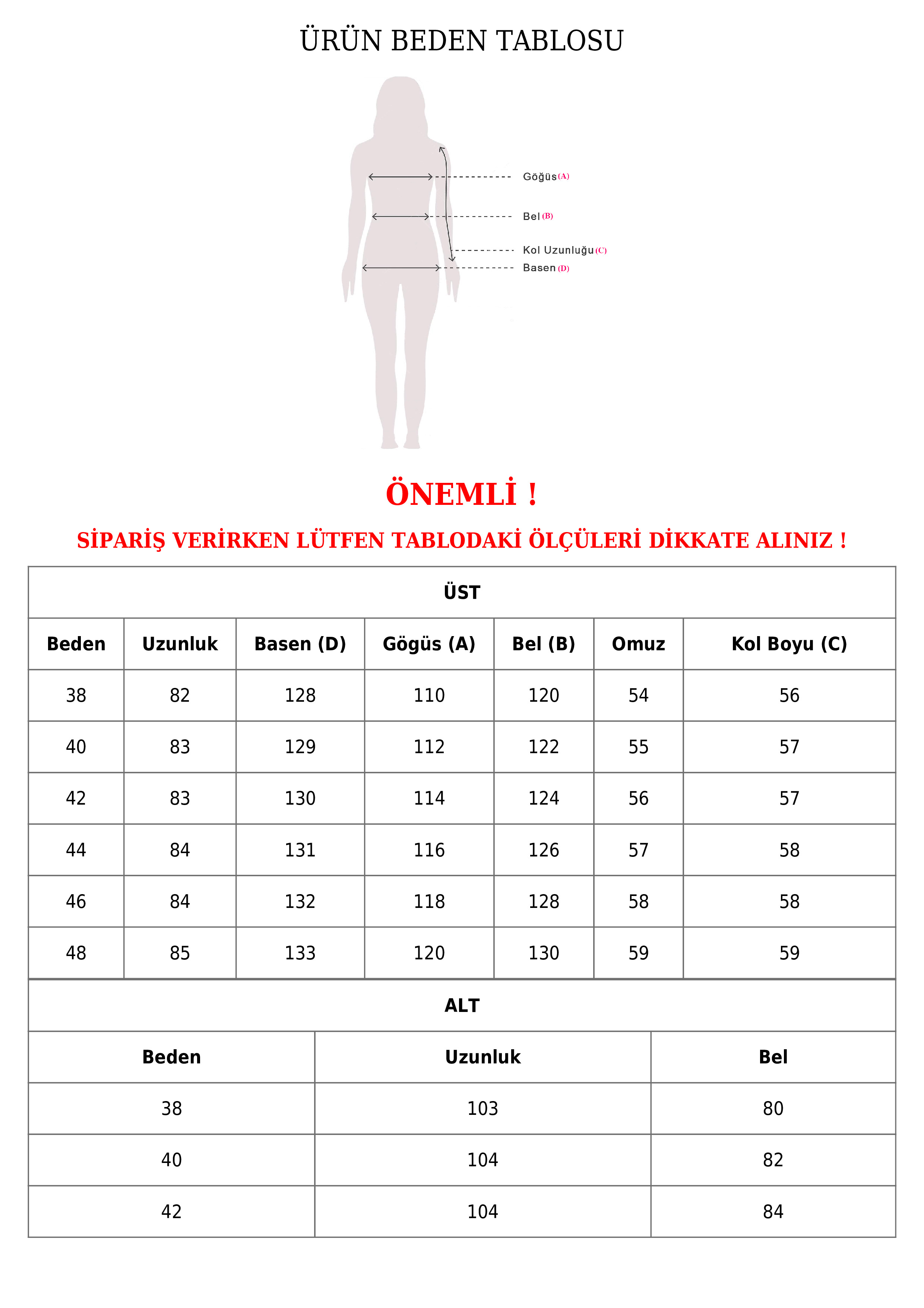 | Beden | Uzunluk | Basen | Göğüs | Bel | Omuz | Kol Boyu |