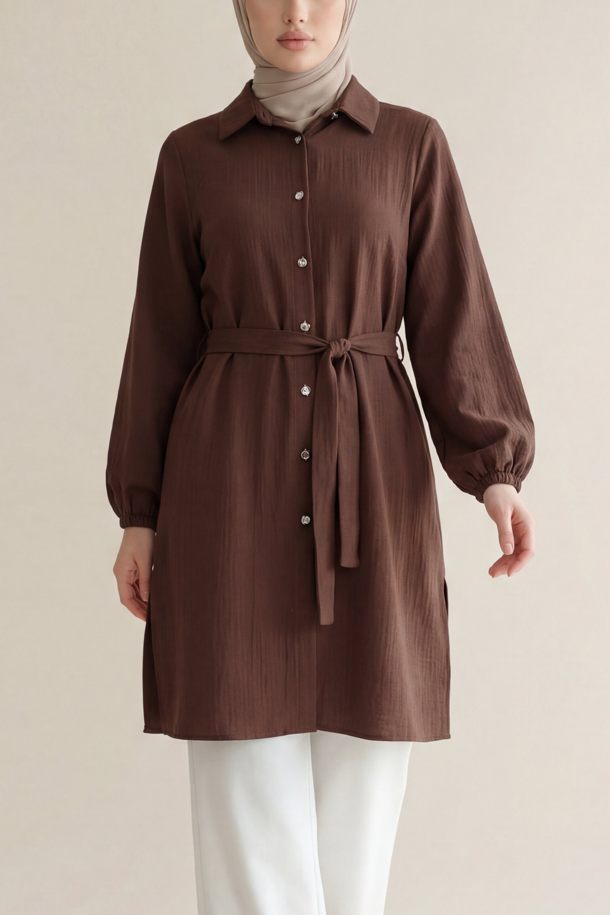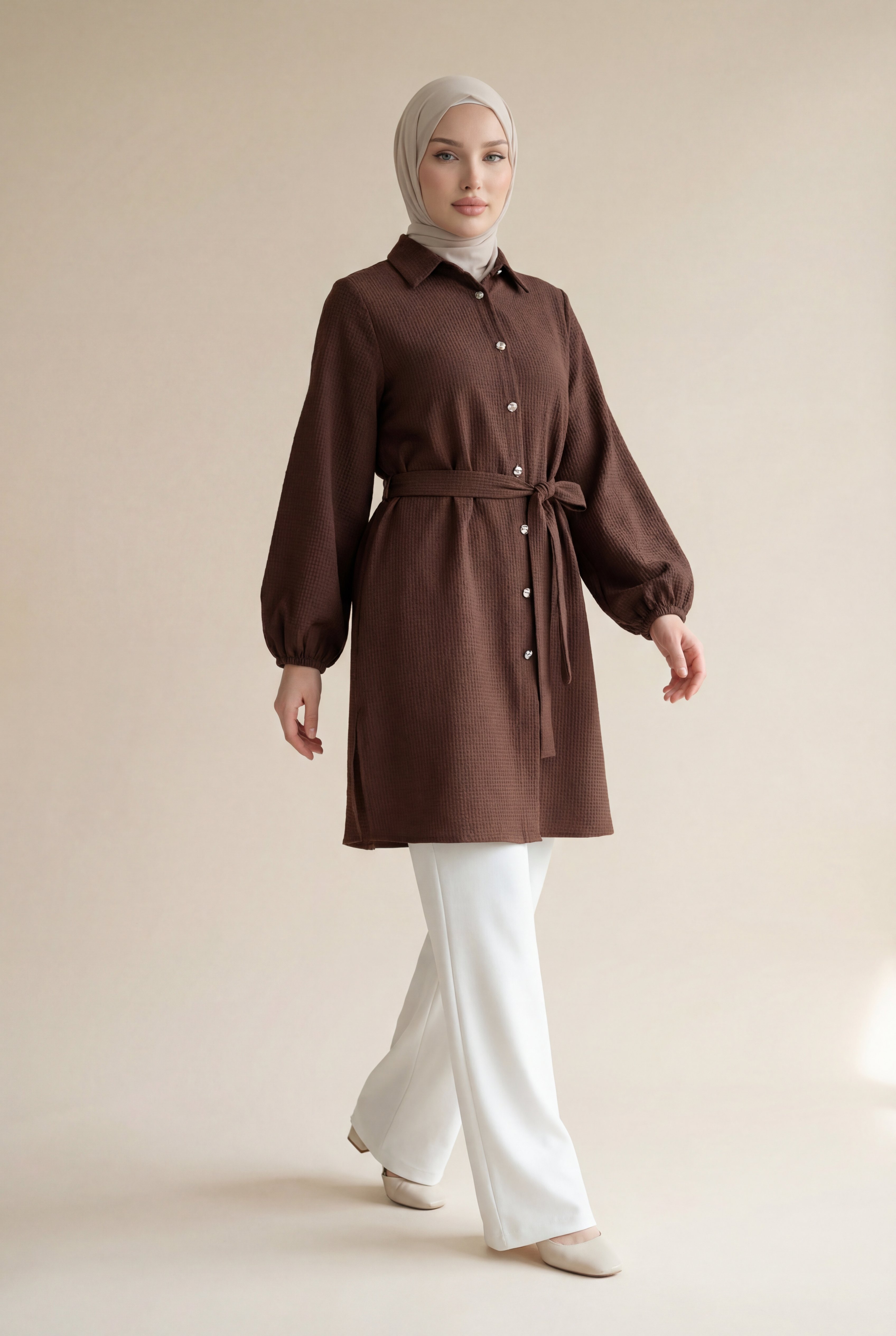 Doğal dokusu ve rahat kesimiyle öne çıkan Kolu Lastikli Beli Bağcıklı Uzun Müslin Tunik, gün boyu konforlu ve şık bir kullanım sunar. Müslin kumaşın hafif ve nefes alabilen yapısı sayesinde özellikle sıcak havalarda ferah bir his sağlar. Kolu lastikli tasarımı hareket özgürlüğü sunarken, beli bağcıklı detayı vücut hatlarını nazikçe vurgular. Uzun boyu sayesinde pantolon ve taytlarla kolayca kombinlenerek hem günlük hem de rahat şık stiller oluşturmanıza yardımcı olur.
