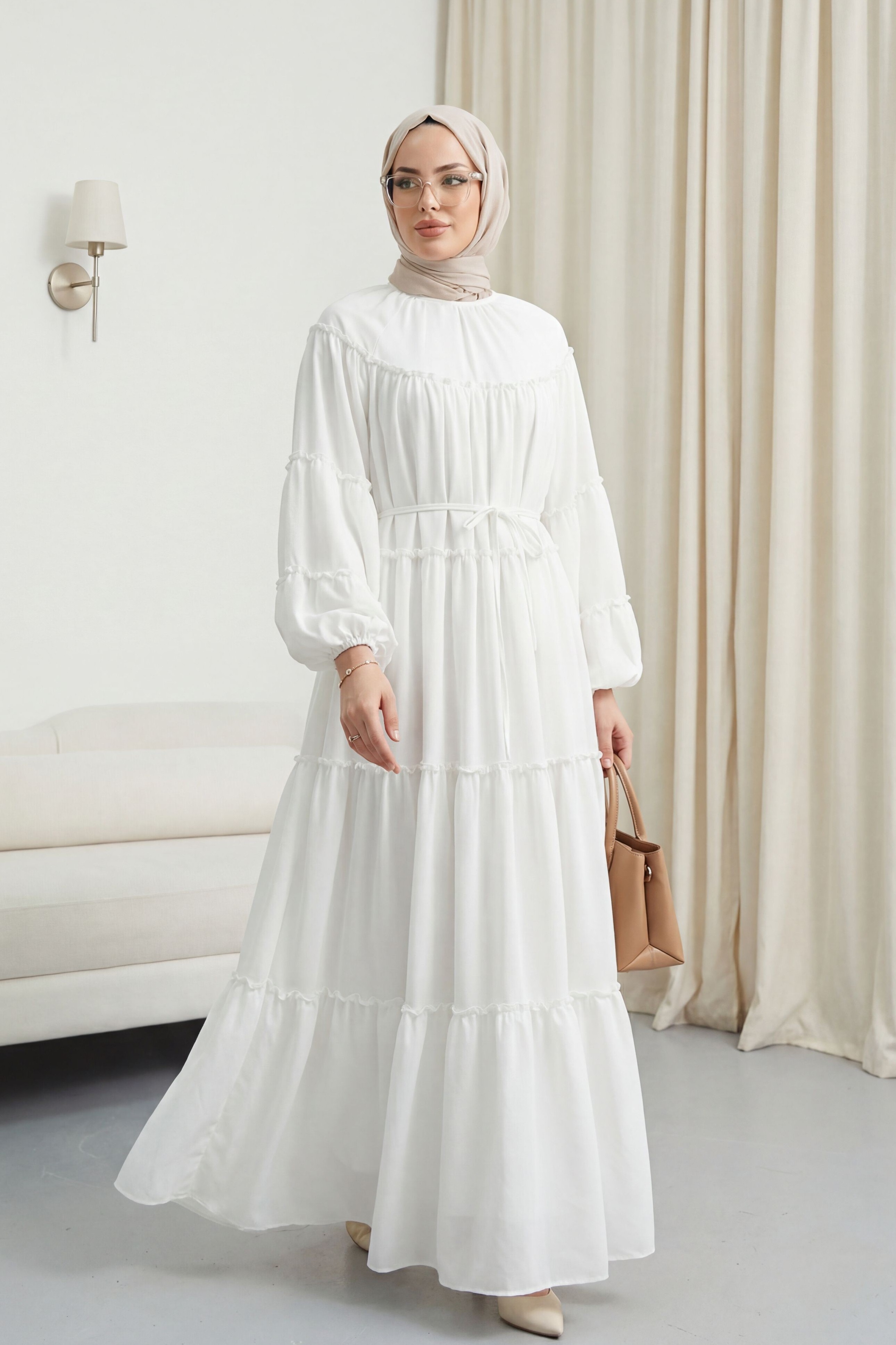 “Beli bağlamalı elbise”, “katlı fırfırlı elbise”, “kolu lastikli kadın elbise”, “günlük şık elbise” gibi adlandırılabilir.