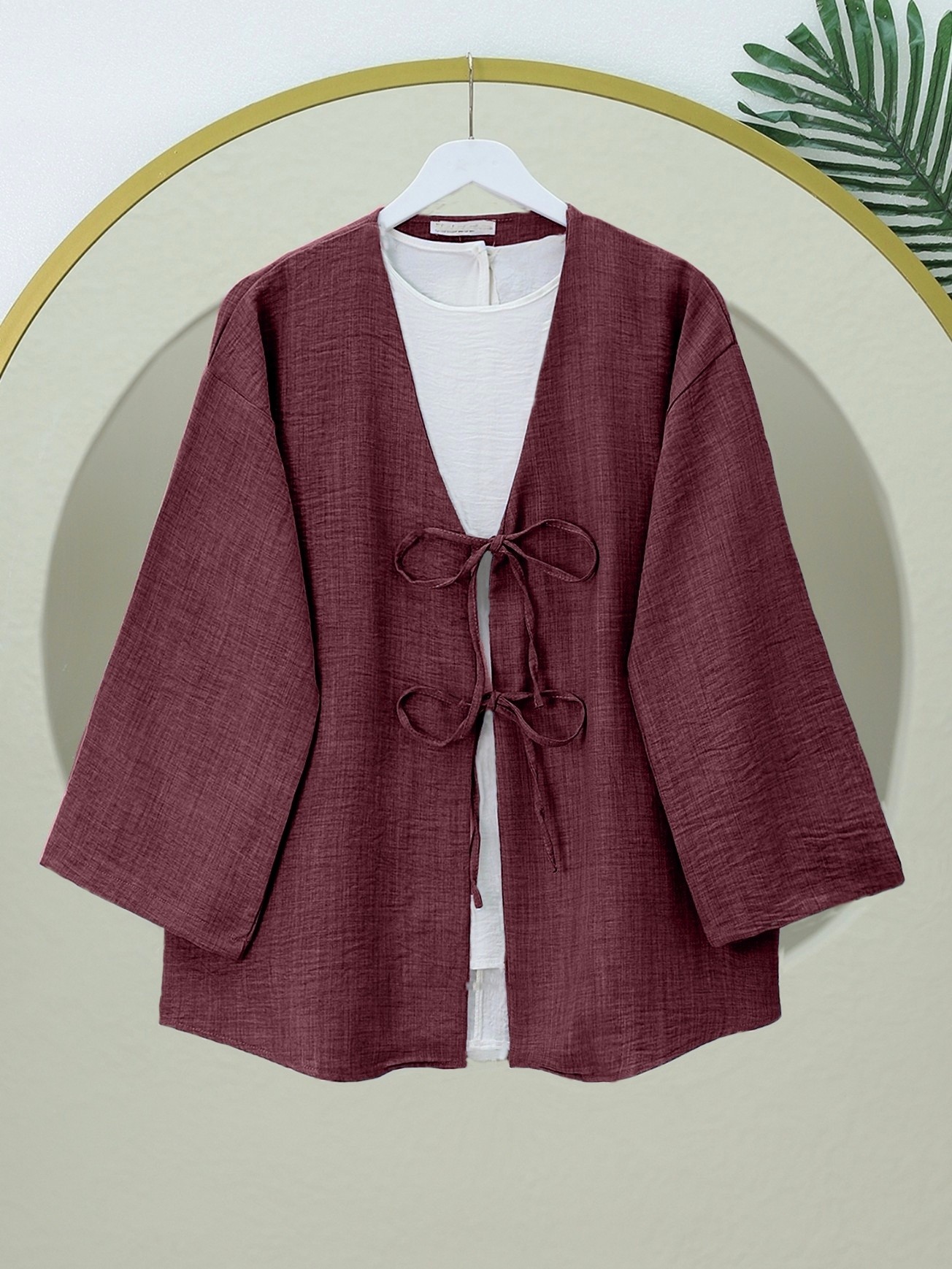 Önü Bağcıklı Keten Kimono, hafif ve nefes alabilen keten kumaşıyla yaz aylarının vazgeçilmezi. Zarif bağcık detayı, modern kesimi ve rahat kalıbıyla şıklığı ve konforu bir arada sunar. Günlük kombinlerde rahatça kullanabileceğiniz şık bir seçenek!