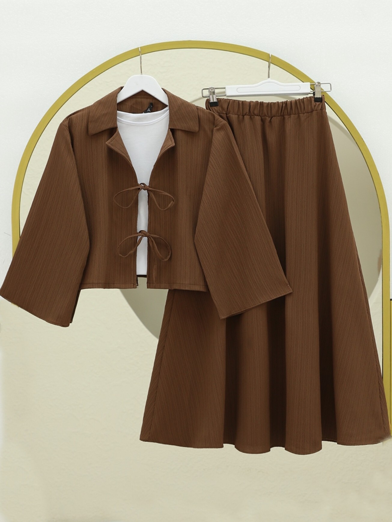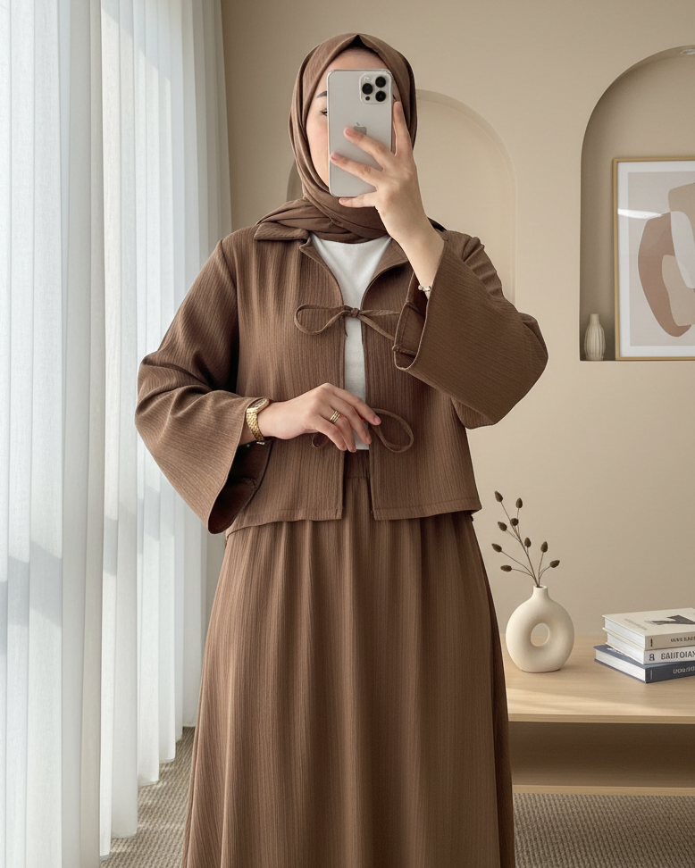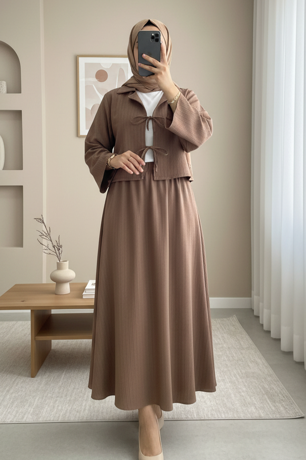 Hafif ve dökümlü yapısıyla öne çıkan Önü Bağlamalı Etekli Krinkıl Takım, modern tasarımıyla gün boyu şıklık ve konfor sunar. Krinkıl kumaşın doğal kırışık dokusu sayesinde ütü gerektirmez; önü bağlamalı üst ve uyumlu etek detayıyla sade ama etkileyici bir görünüm sağlar. Hem günlük hem özel anlar için ideal!