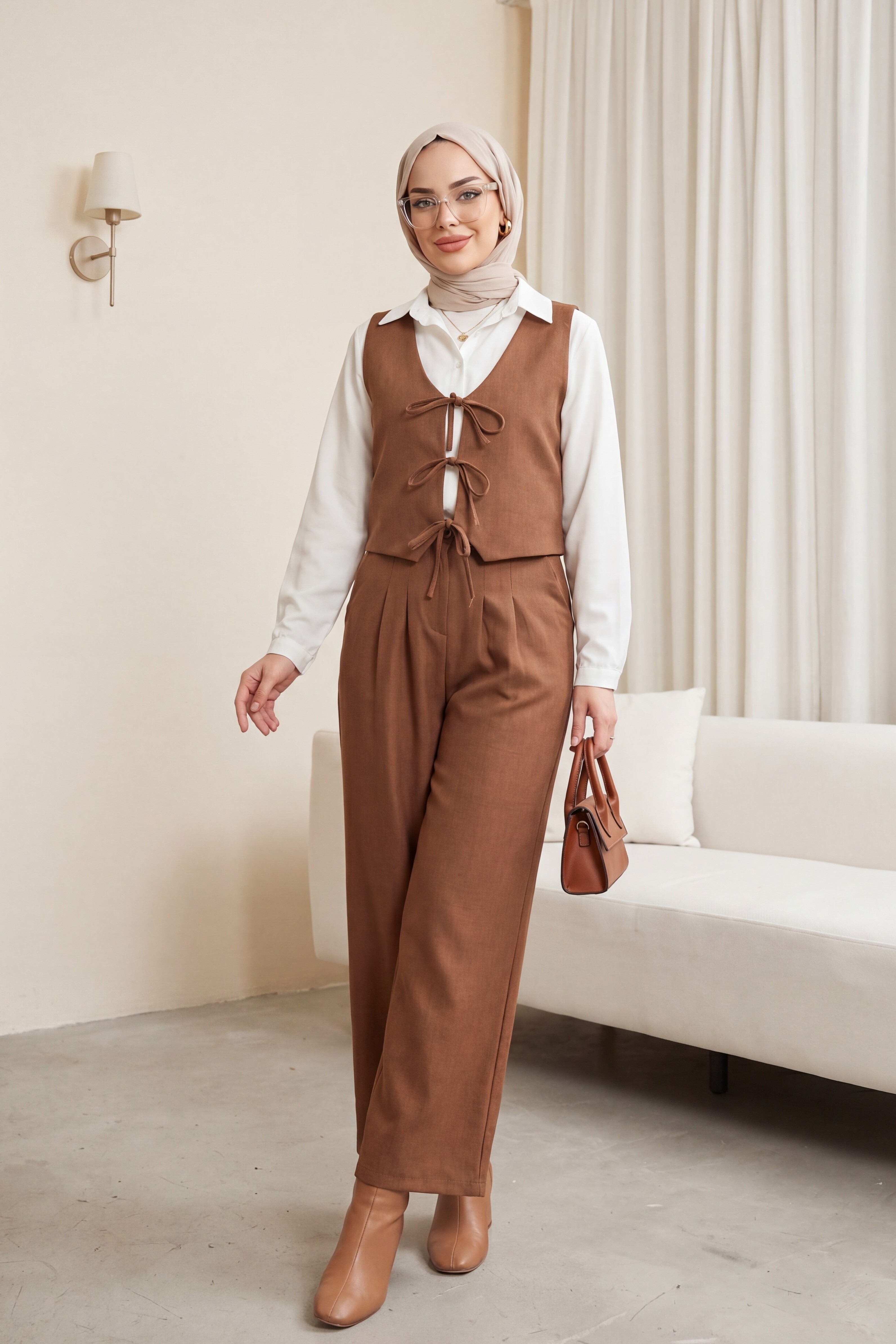 Önü Bağlamalı Yelek Pantolon İkili Takım, modern kesimi ve bağlama detaylı yeleğiyle stil sahibi bir görünüm sunar. Rahat pantolonu ile gün boyu konfor sağlarken, şıklığınızdan ödün vermez. Ofis, davet ya da günlük kombinler için ideal bir tercih!