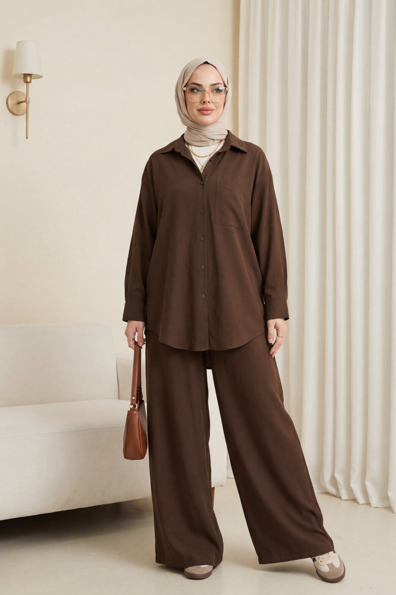 Zamansız tasarımı ve konforlu kesimiyle öne çıkan Önü Düğmeli Tek Cepli Gömlek Pantolon Takım, hem günlük hem de ofis şıklığı için ideal bir tercih! Ön kısmındaki düğmeli form klasik ve düzenli bir görünüm sunarken, tek cep detayı tasarıma sade ve modern bir hava katar. Gömlek ve pantolondan oluşan takım formu sayesinde zahmetsiz ve bütüncül bir stil oluşturur. Rahat kesimi ve akışkan yapısı gün boyu konfor sağlarken, vücuda oturan fakat sıkmayan ideal kalıbı ile dengeli ve estetik bir siluet sunar. Günlük kombinlerden iş stiline kadar geniş bir kullanım alanına sahiptir.