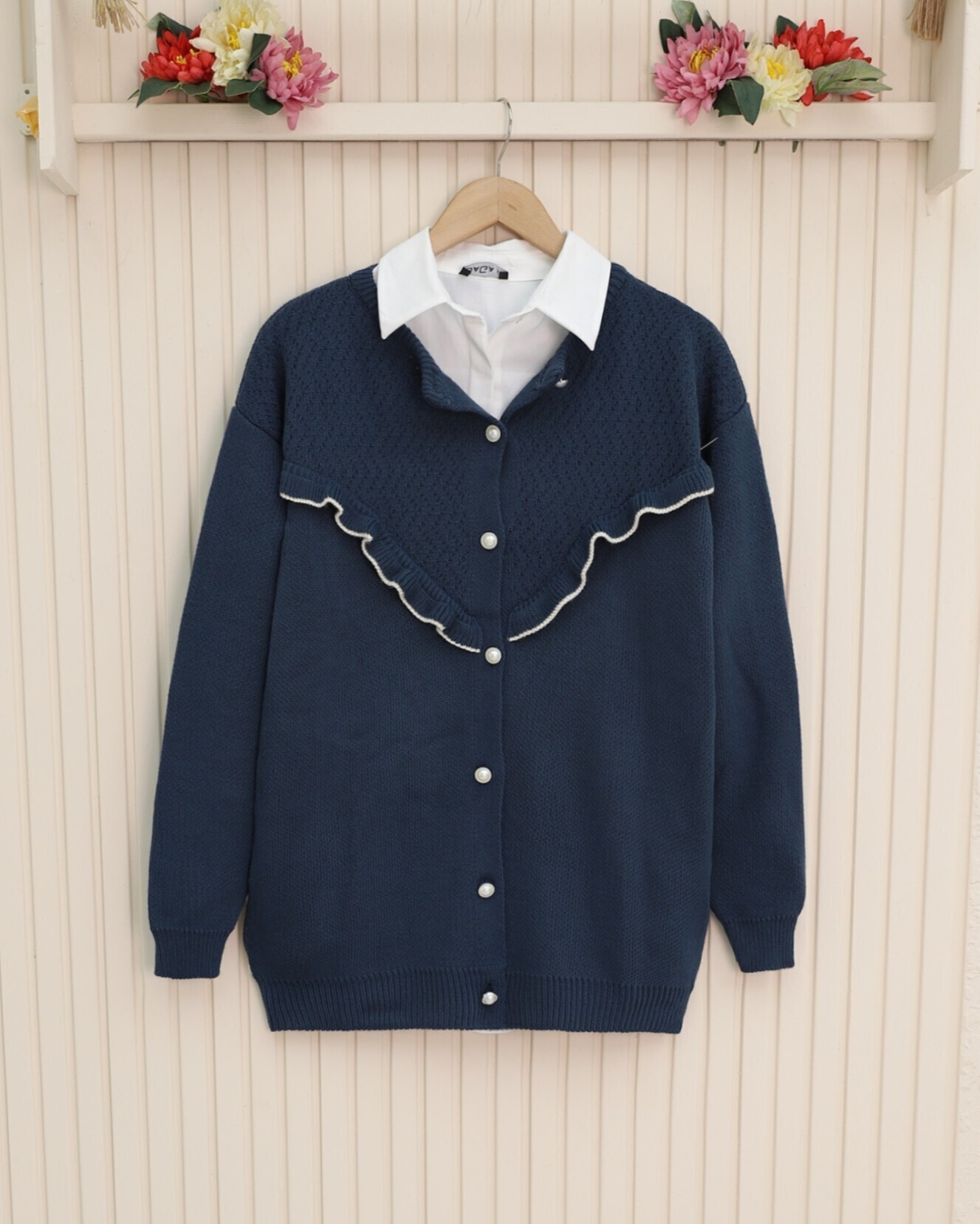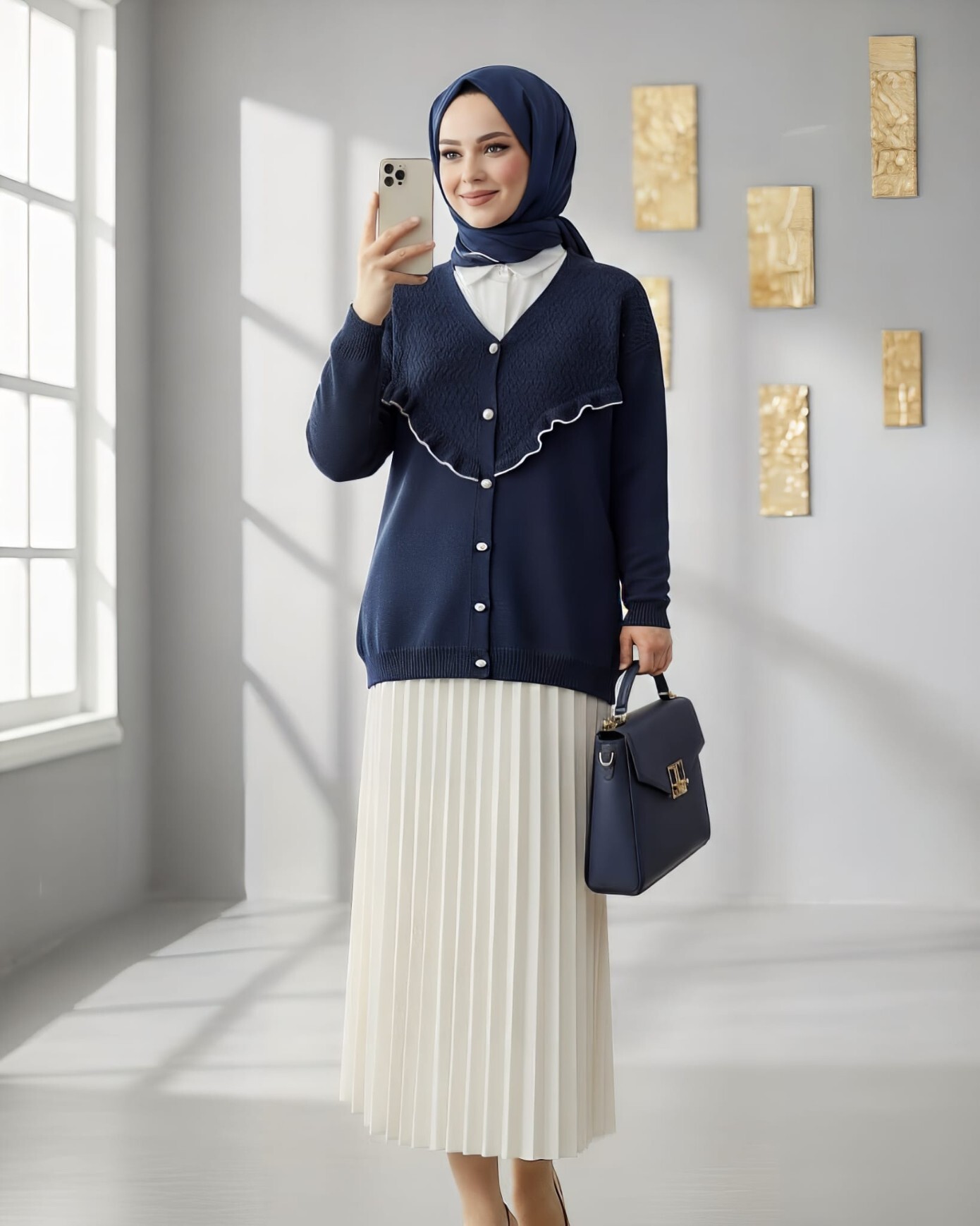 Önü fırfırlı, incili, düğmeli triko hırka; zarif ve şık bir dış giyim parçasıdır. Ön kısmındaki fırfır detayı, hırkaya feminen bir hava katarken, incili düğmeler ise şıklığına sofistike bir dokunuş ekler. Yumuşak triko kumaşı, rahat bir kullanım sağlar ve soğuk havalarda sıcak tutar. Hem günlük kullanımda hem de özel davetlerde tercih edilebilecek bu hırka, zarif detaylarıyla her tarza uyum sağlar. Hem şıklığı hem de konforu bir arada sunan bu parça, gardırobunuzda yer alması gereken mükemmel bir tercihtir.