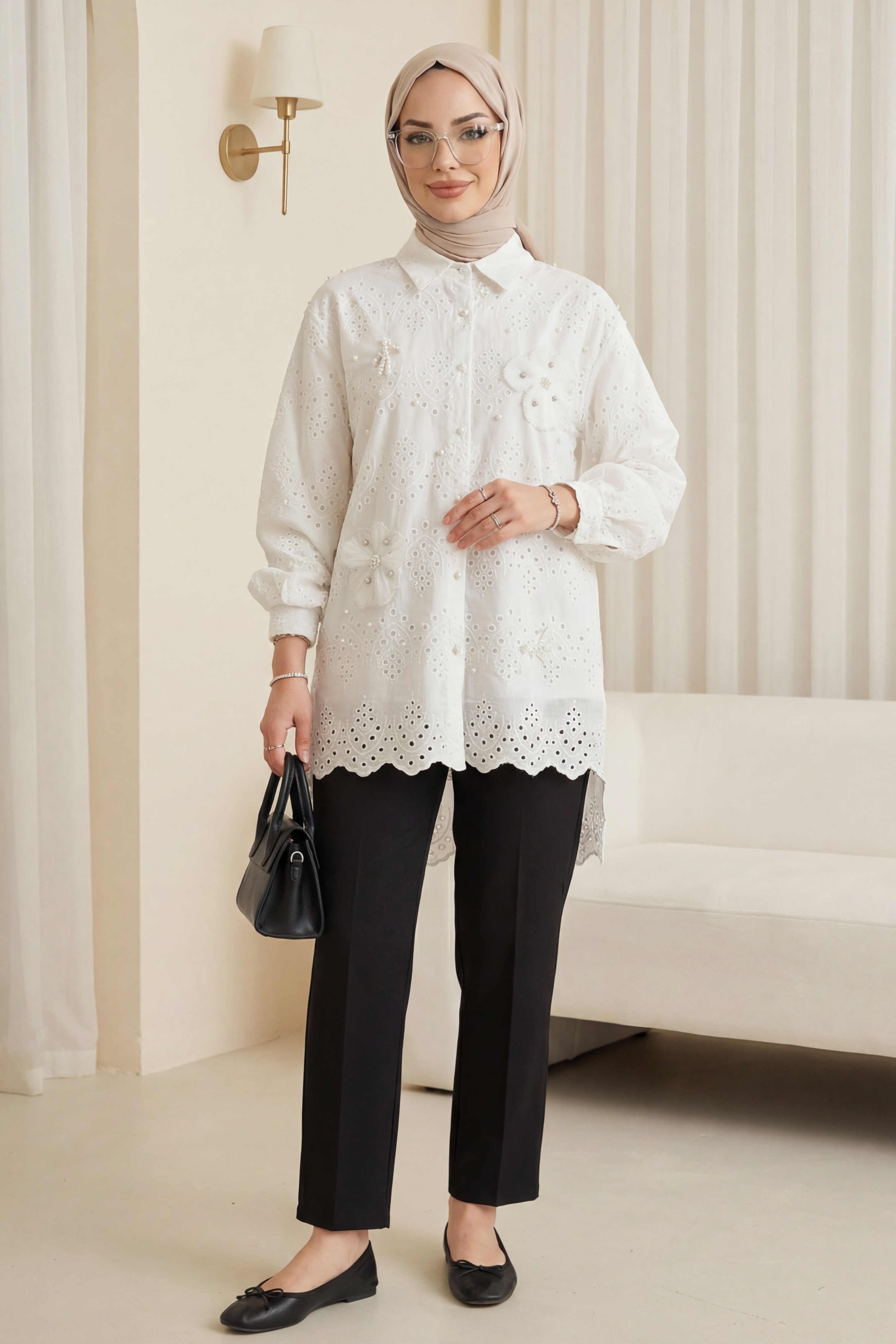 “organze detaylı tunik”, “inci düğmeli tunik”, “fistolu uzun tunik”, “şık kadın tunik modeli” gibi adlandırılabilir.