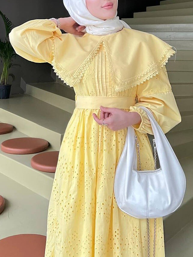 Pelerin Yaka Dantel Detaylı Elbise ile zarif ve şık bir görünüm elde edin. Pelerin yaka tasarımı ve dantel detayları, elbiseye feminen ve zarif bir hava katar. Hem özel günlerde hem de şık davetlerde tercih edilebilecek mükemmel bir seçenek.