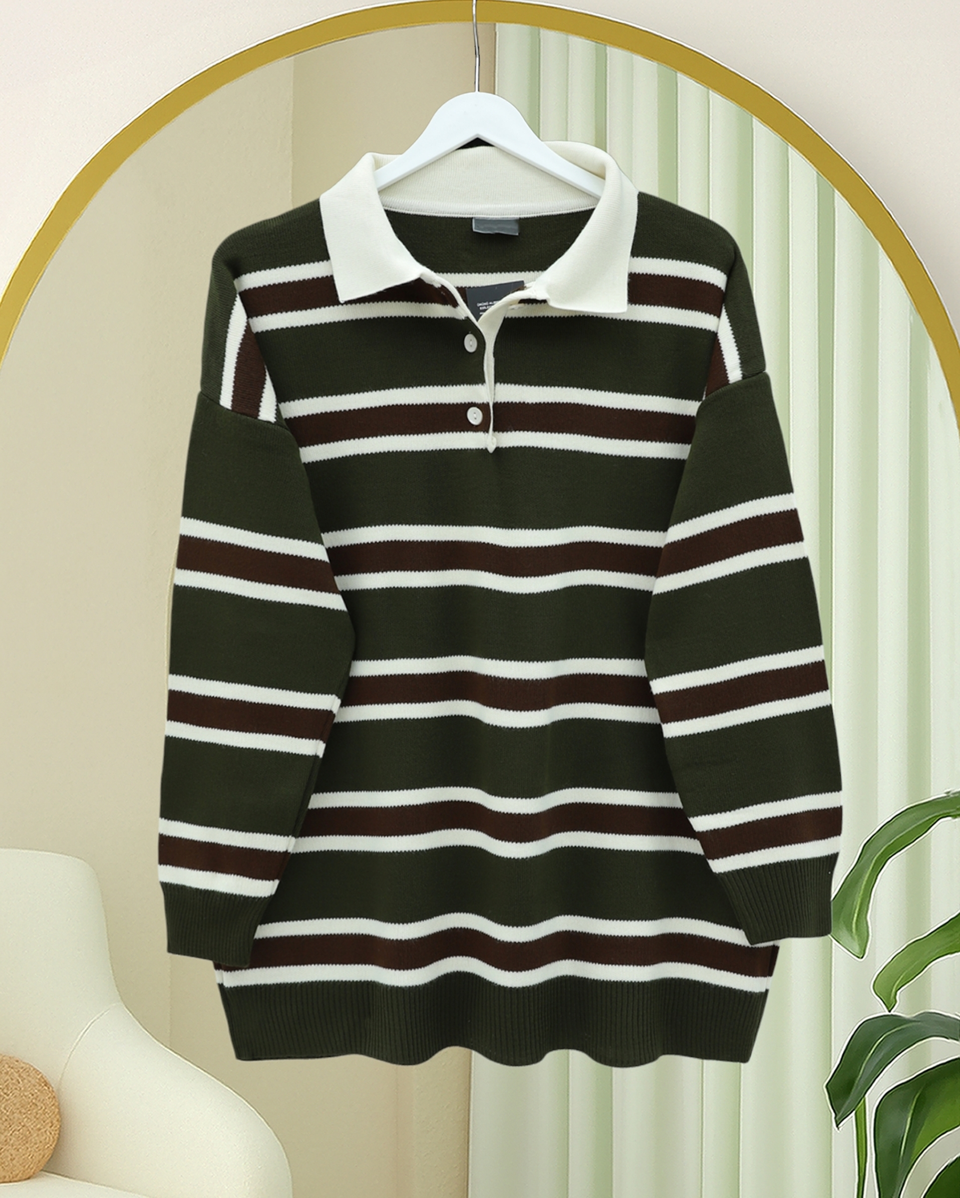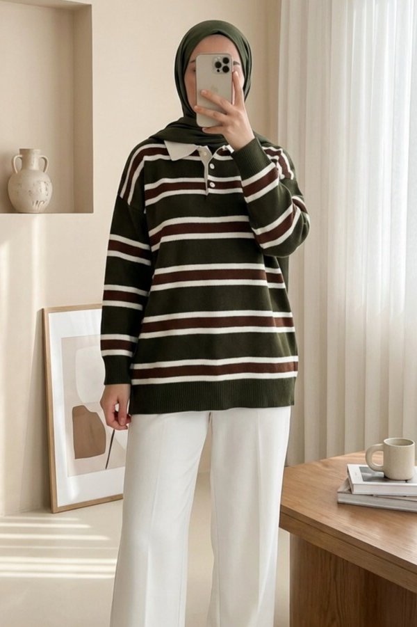 Canlı renkleri ve modern çizgileriyle dikkat çeken Polo Yaka Yarım Düğmeli Renkli Çizgili Triko Kazak, günlük şıklığı konforla buluşturan özel bir tasarımdır. Yumuşak triko kumaşı sayesinde gün boyu rahat bir kullanım sunarken, polo yaka ve yarım düğmeli formu modele klasik ama trend bir hava kazandırır. Renkli çizgi detayları, sade kombinlere hareket katarak enerjik bir stil oluşturur.