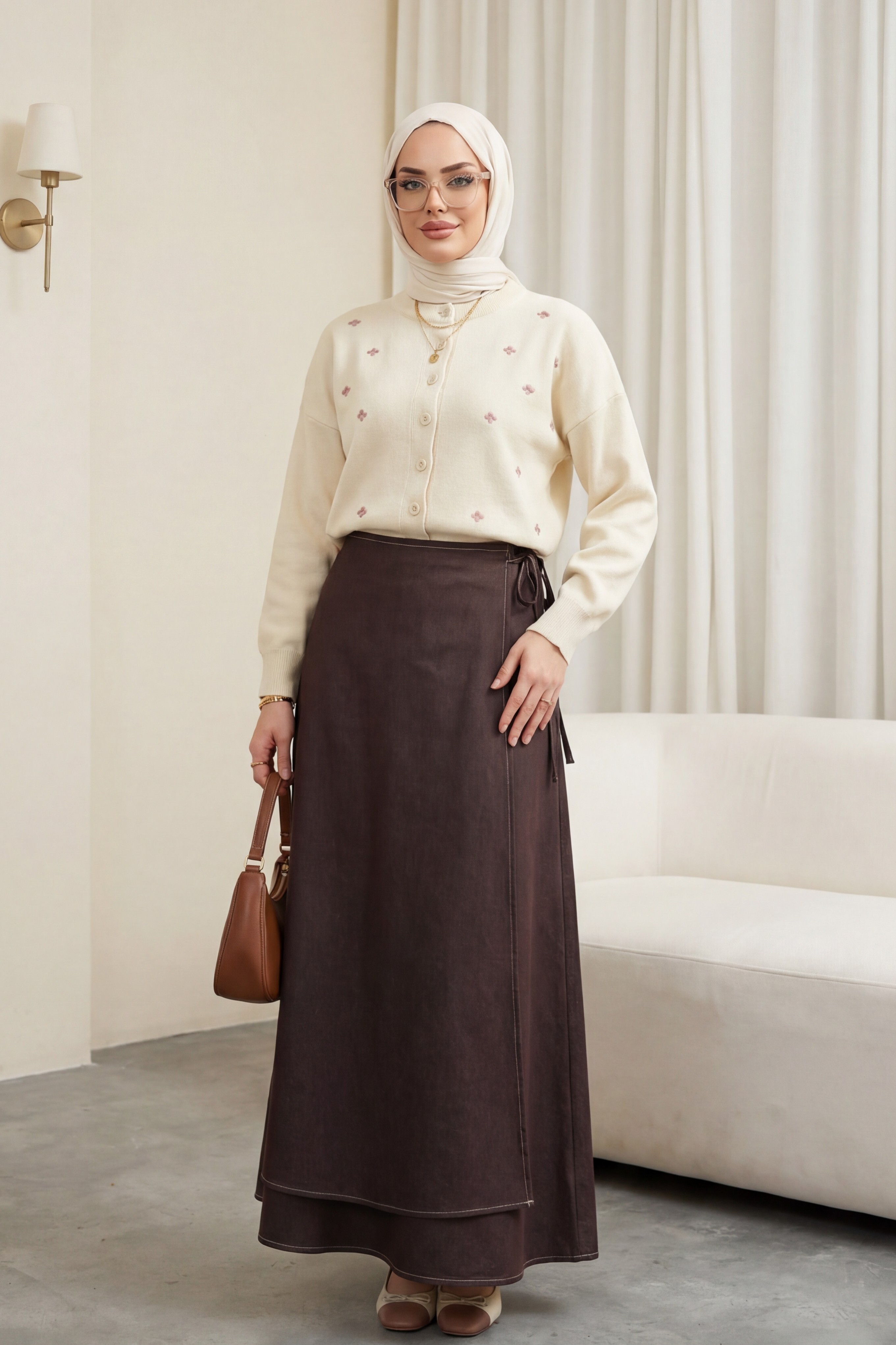 Kombindeki şal, çanta, ayakkabı ve takılar aksesuar olarak kullanılmıştır.