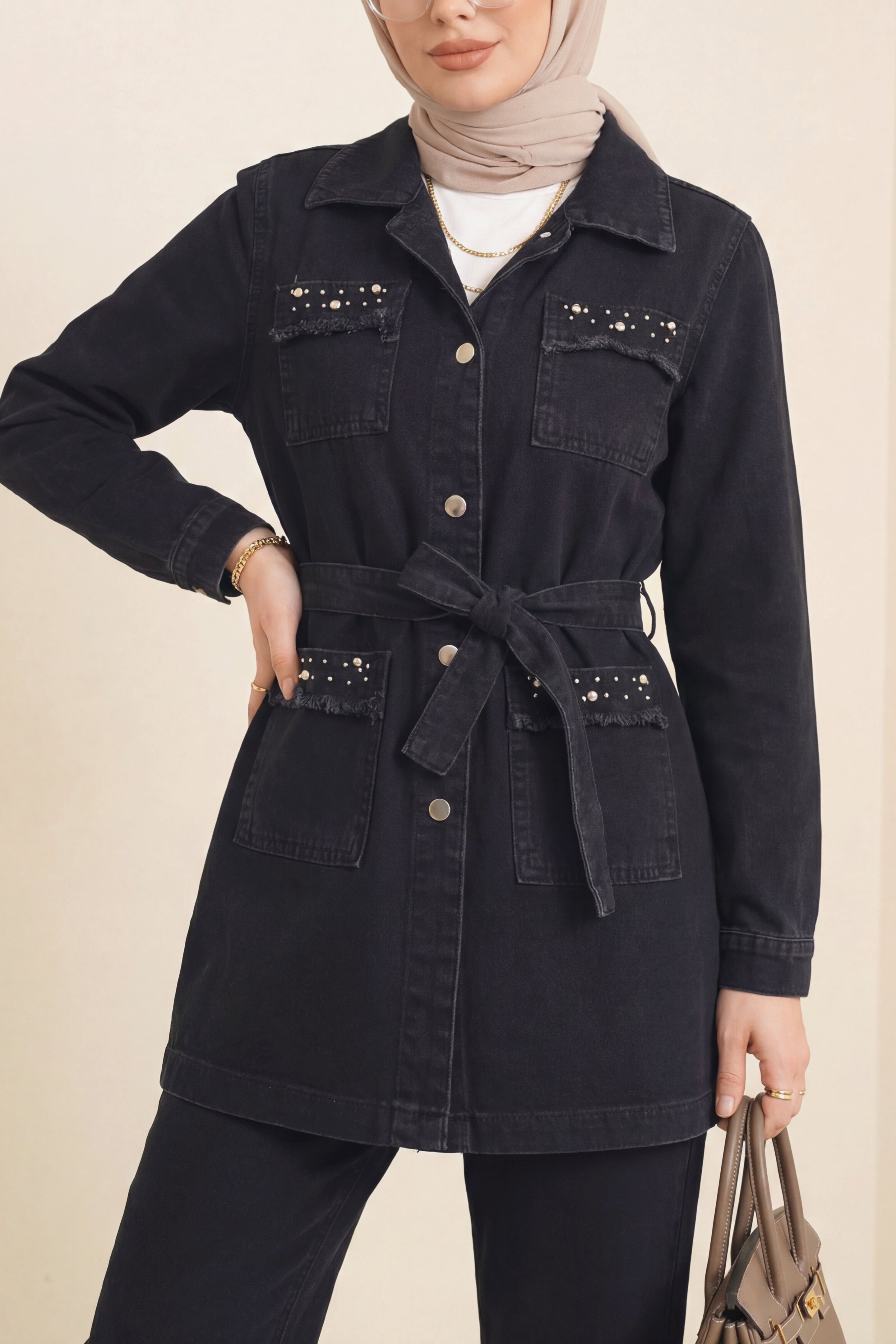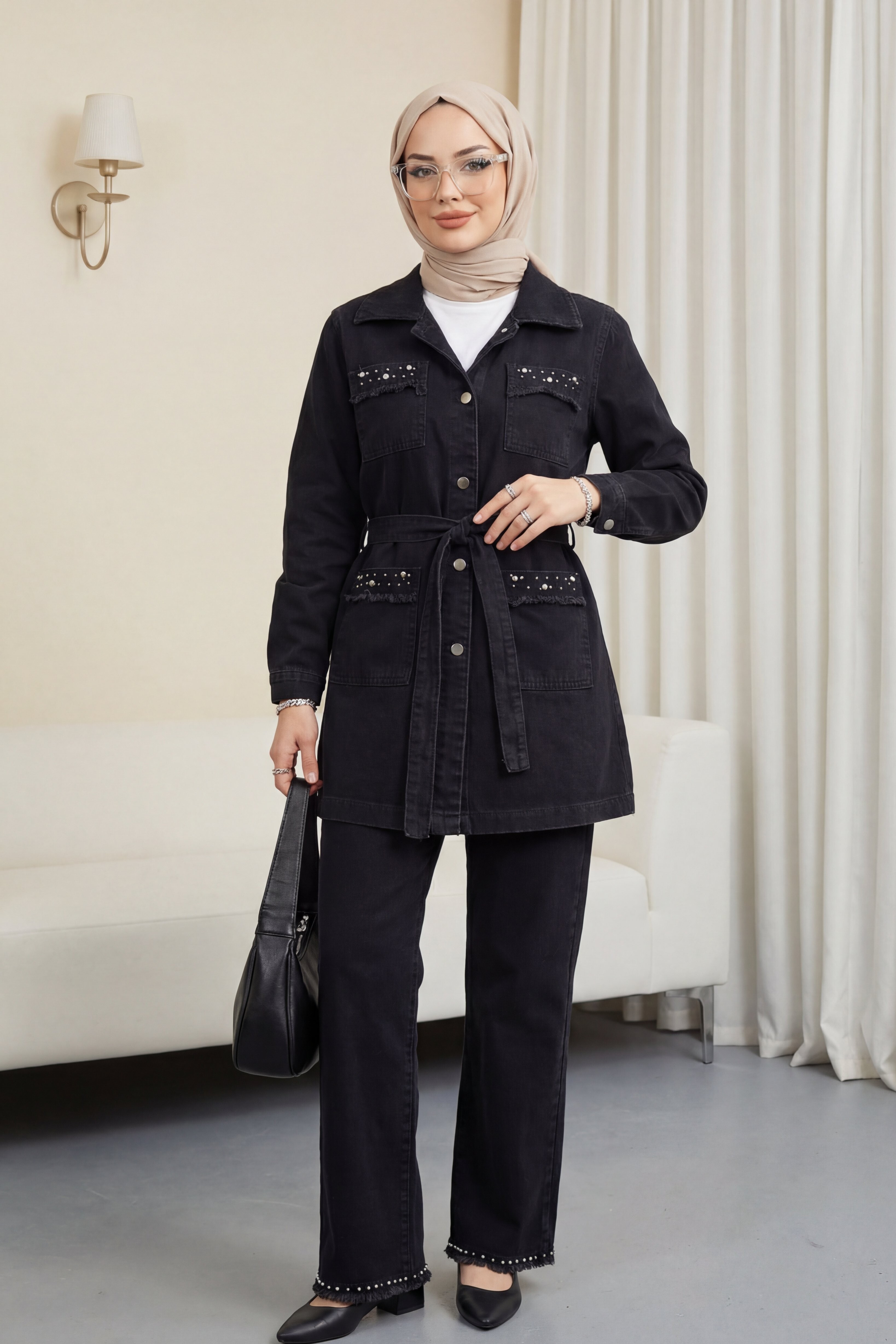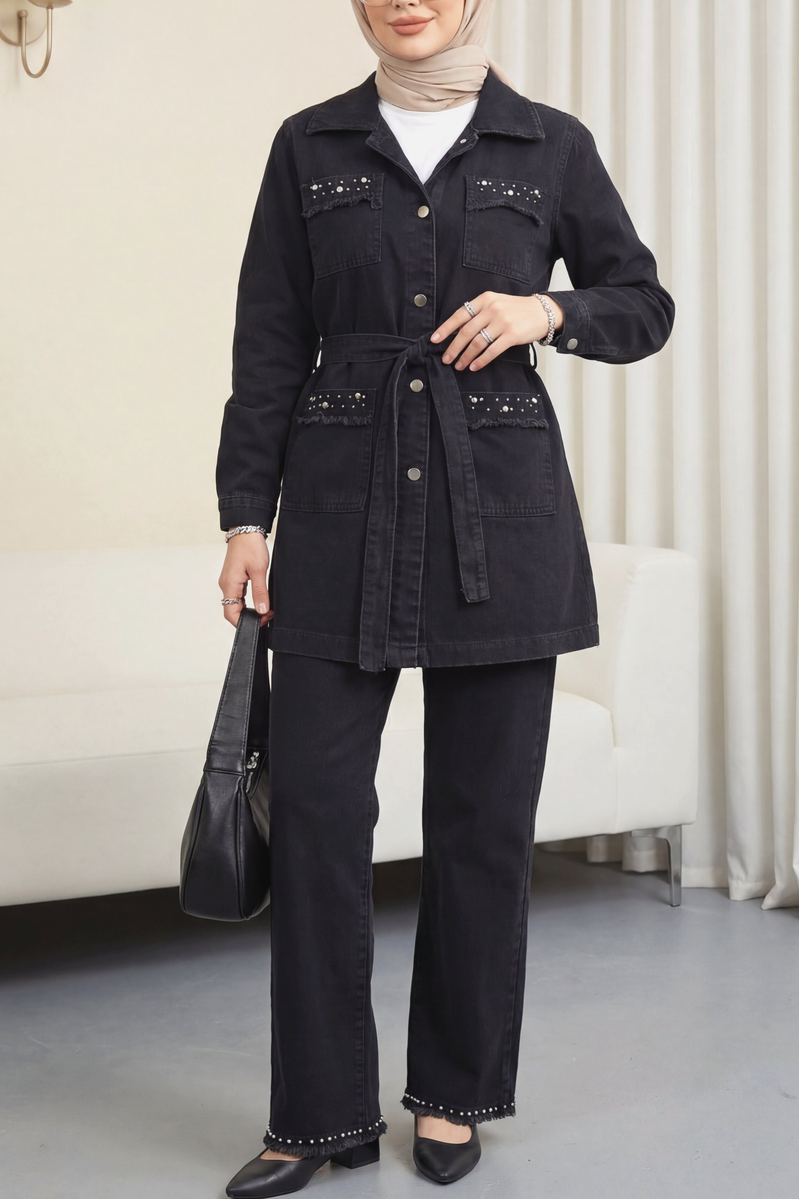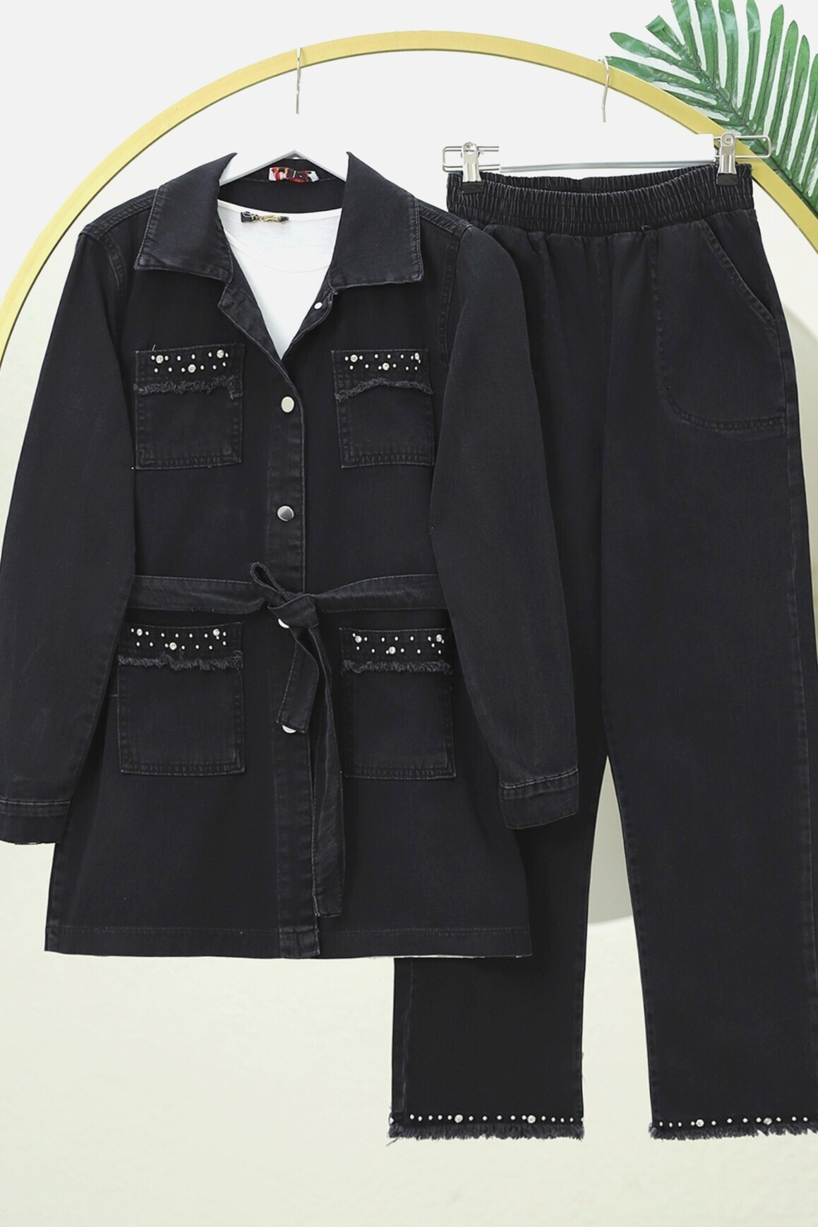 Taş detaylı ceket pantolon kot takım, şıklığı ve zarafeti bir arada sunar. Kot kumaşının rahatlığına taş detaylarıyla ekstra bir parlaklık ve modern bir hava katılmıştır. Hem ofis şıklığı hem de günlük kombinler için ideal olan bu takım, şıklığından ödün vermek istemeyenler için mükemmel bir tercihtir.