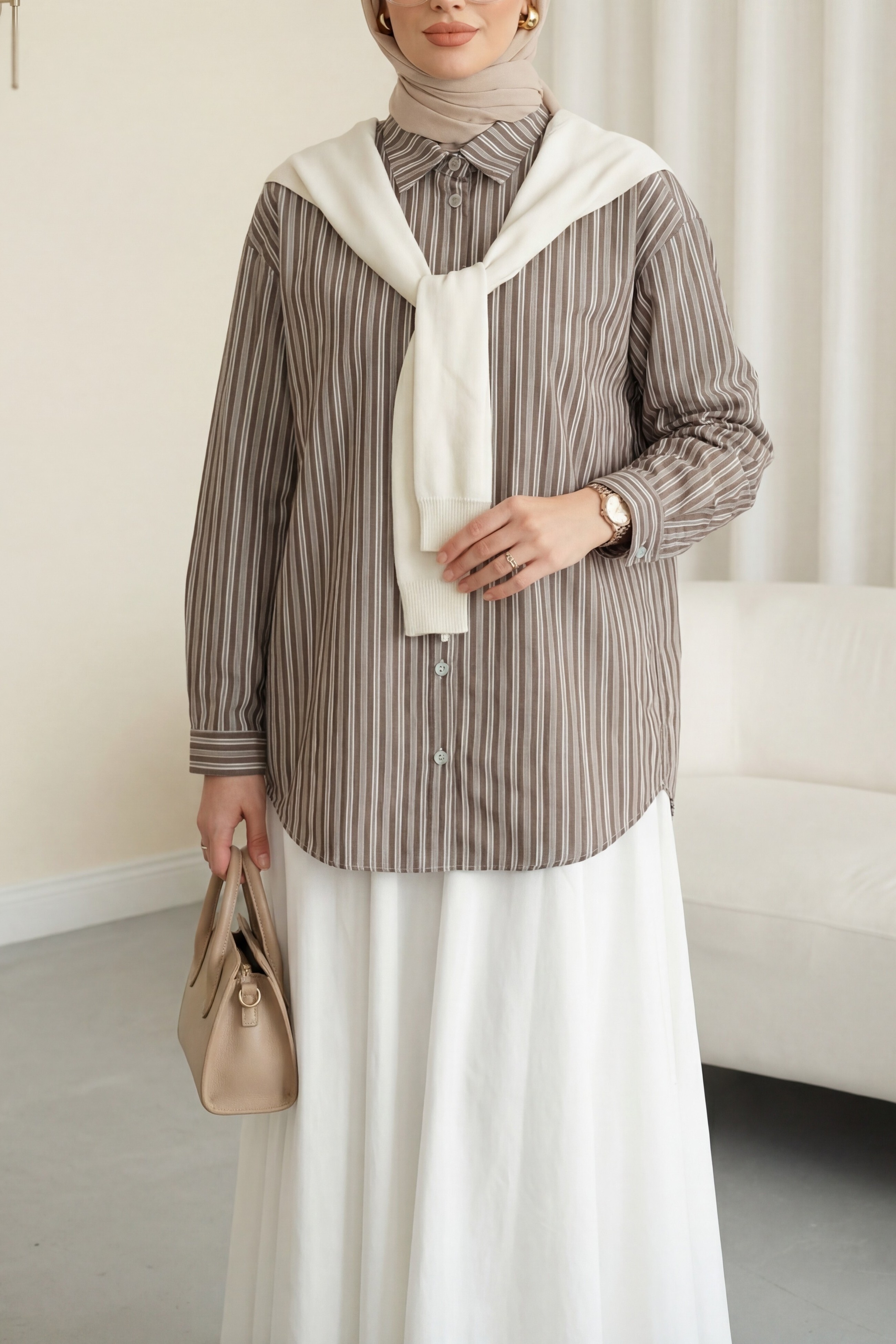 Triko Fular Detaylı Çizgili Keten Gömlek, modern ve zarif bir stil sunar. Çizgili deseni zamansız bir görünüm sağlarken, triko fular detayı tasarıma şık ve farklı bir dokunuş katar. Keten kumaşı hafif ve nefes alabilendir. Günlük ve şık kombinlerde rahatlıkla tercih edilir.