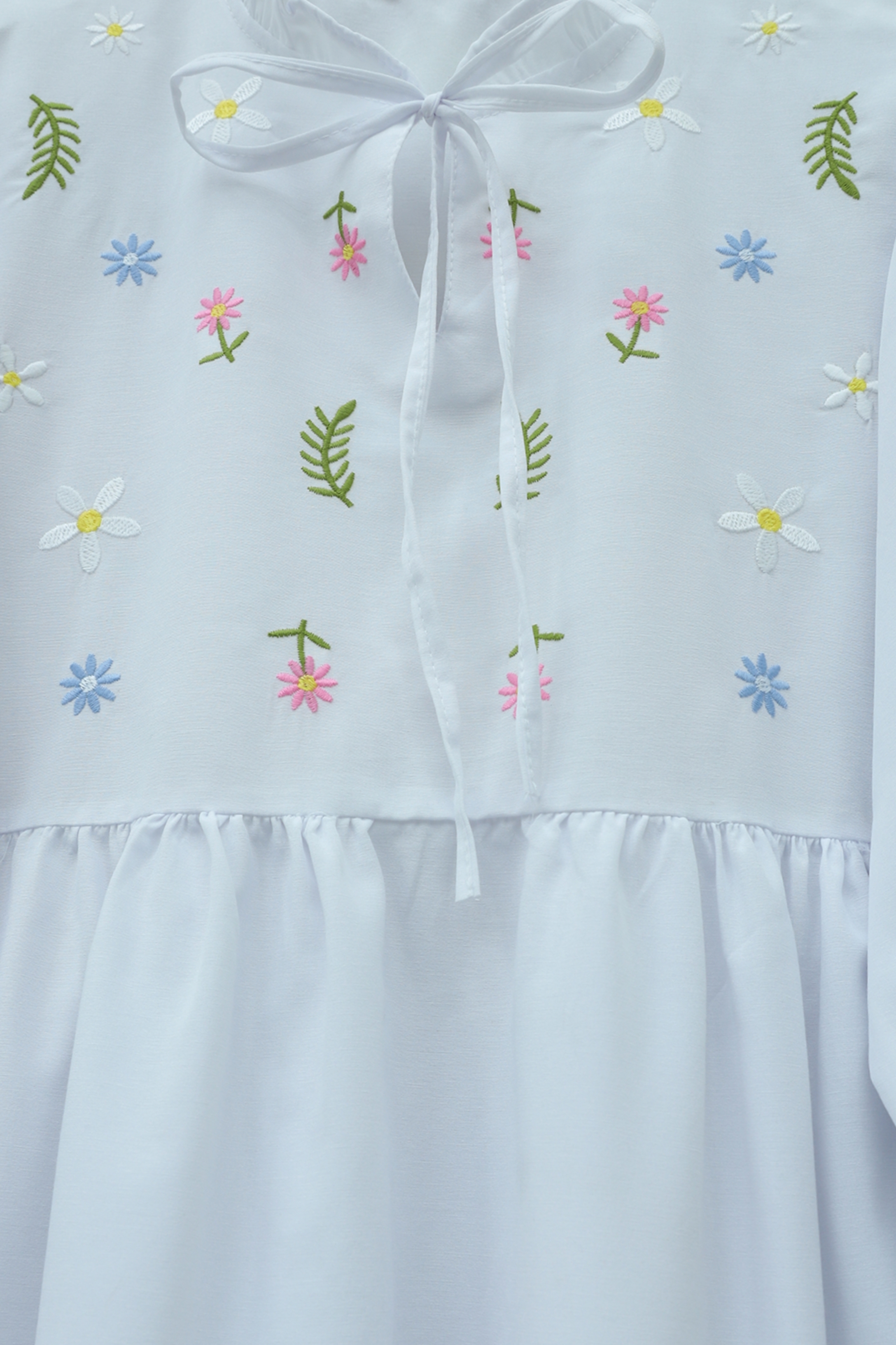V Yaka Bağlamalı Yakası Fırfırlı Çiçek Nakışlı Poplin Tunik -Beyaz