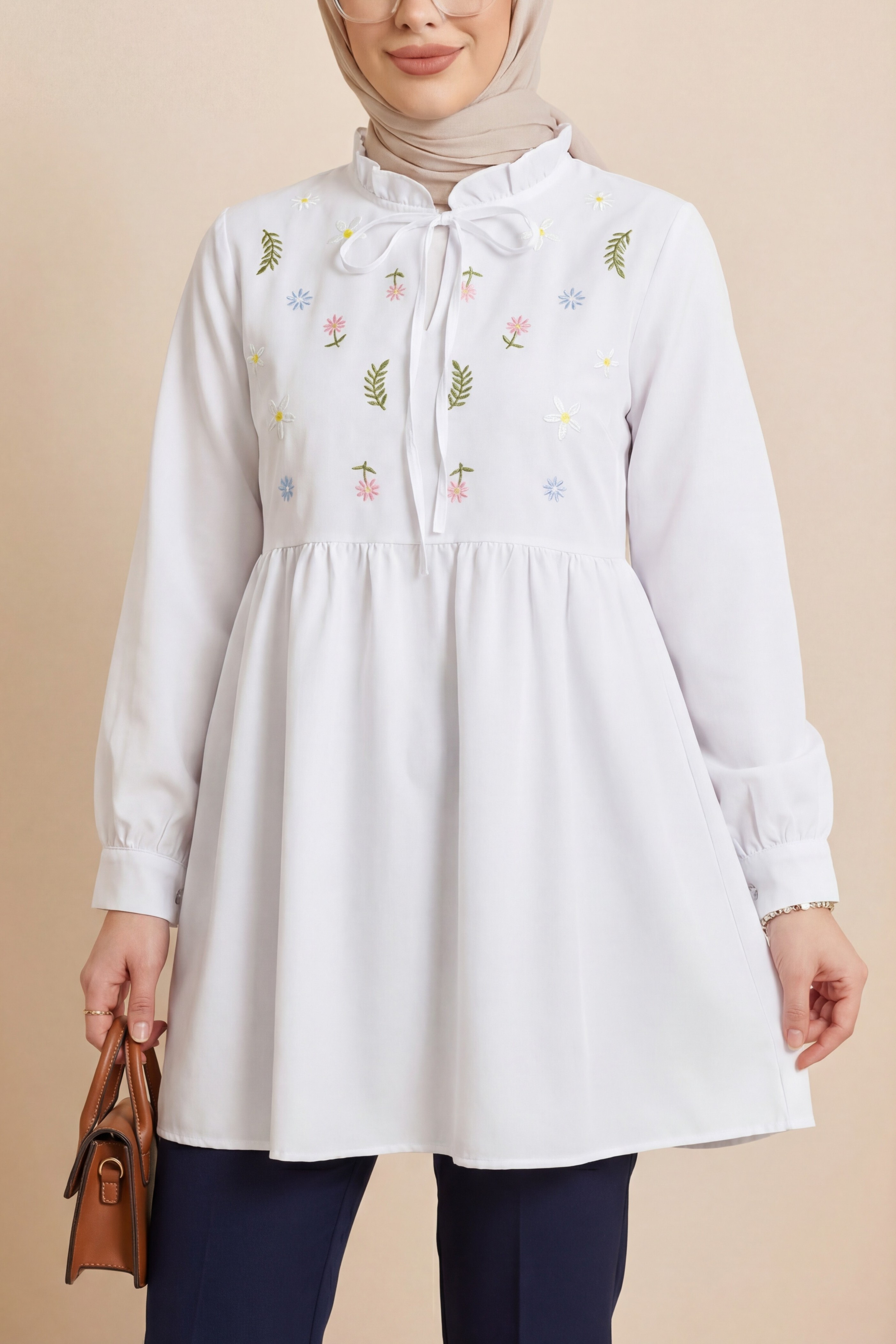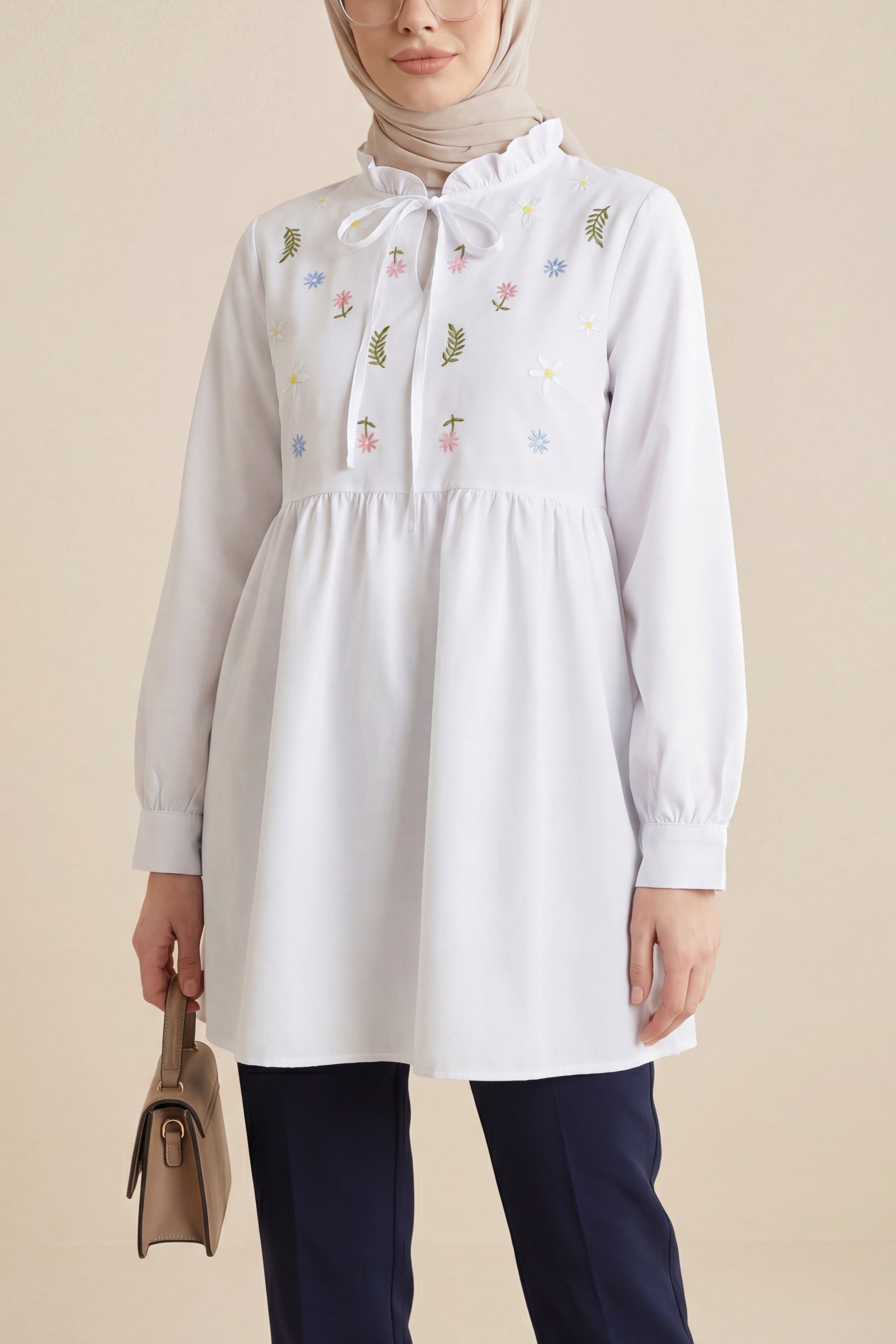 “Çiçek nakışlı tunik”, “fırfırlı poplin tunik”, “bağlamalı kadın tunik”, “romantik tunik modeli” gibi adlandırılabilir.