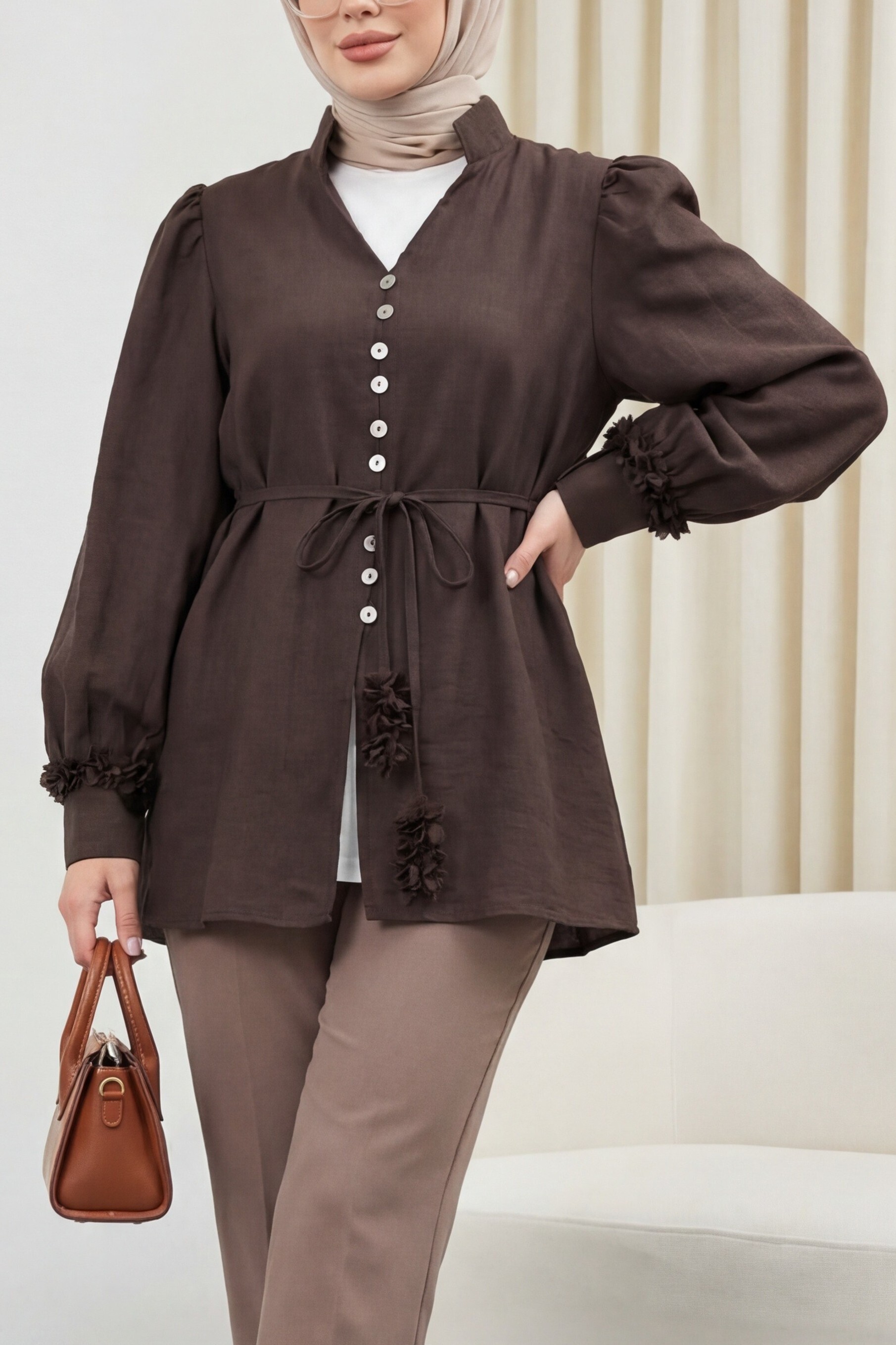 V Yaka Kolu Çiçekli Düğmeli Bağcıklı Modal Gömlek -K. Kahve