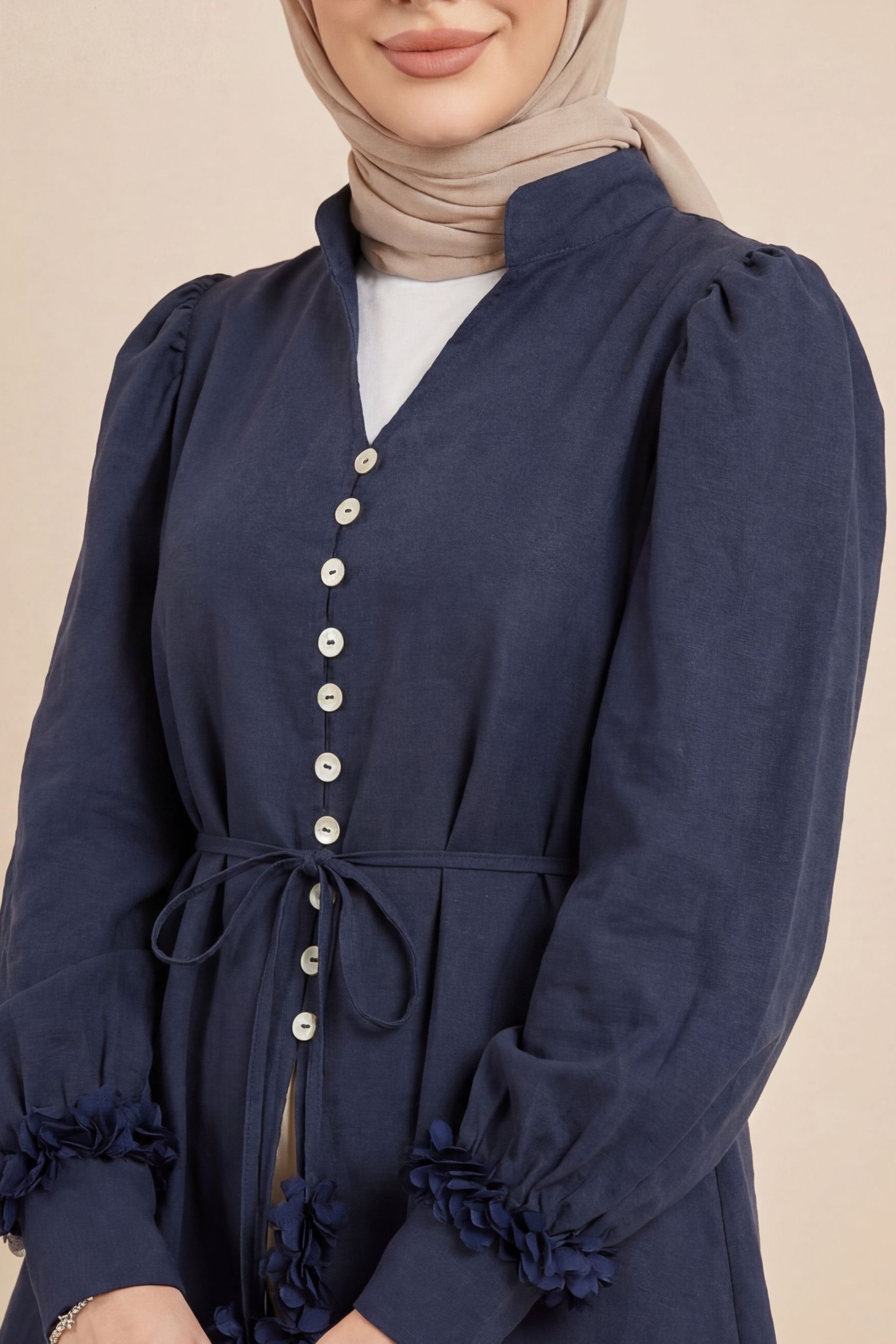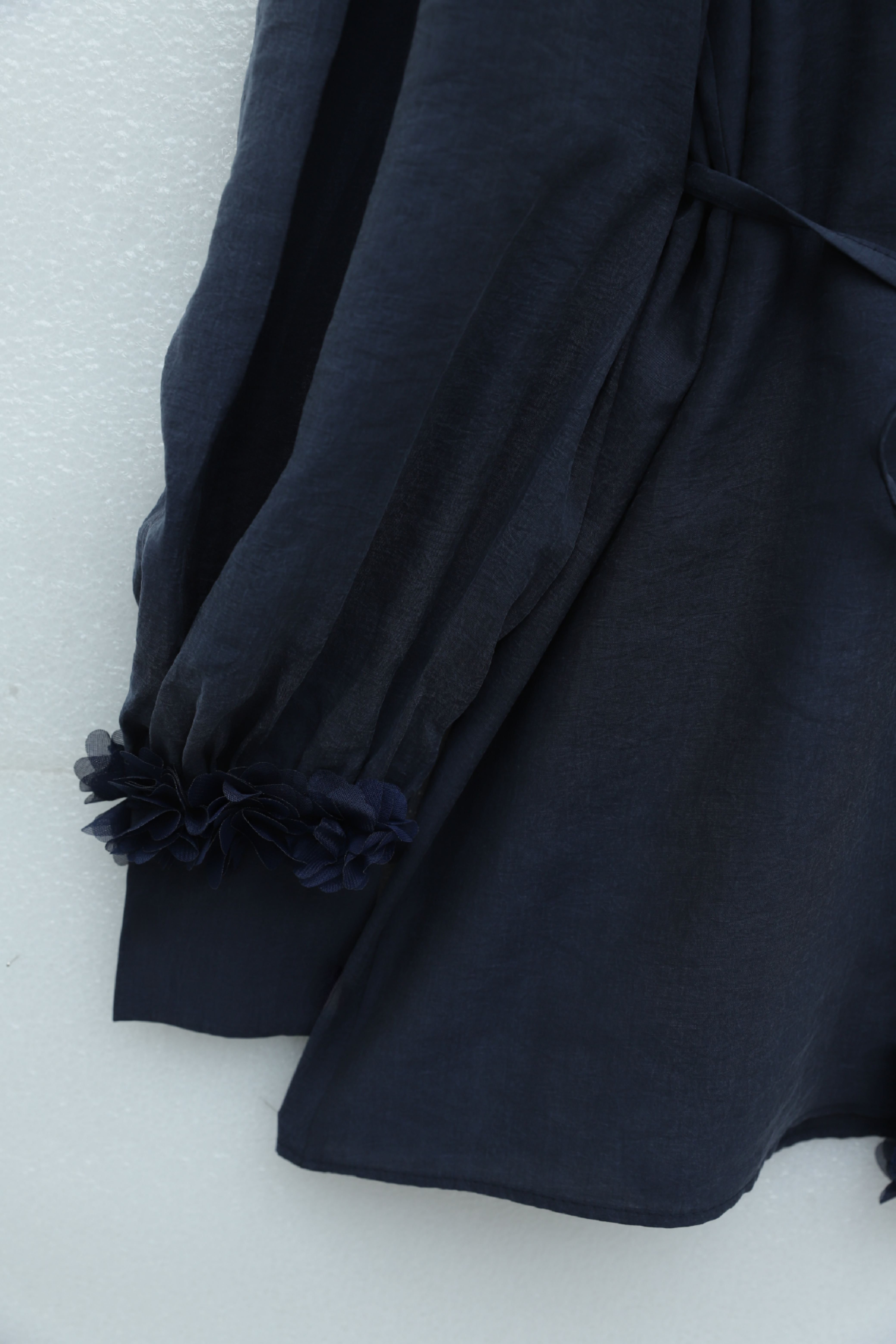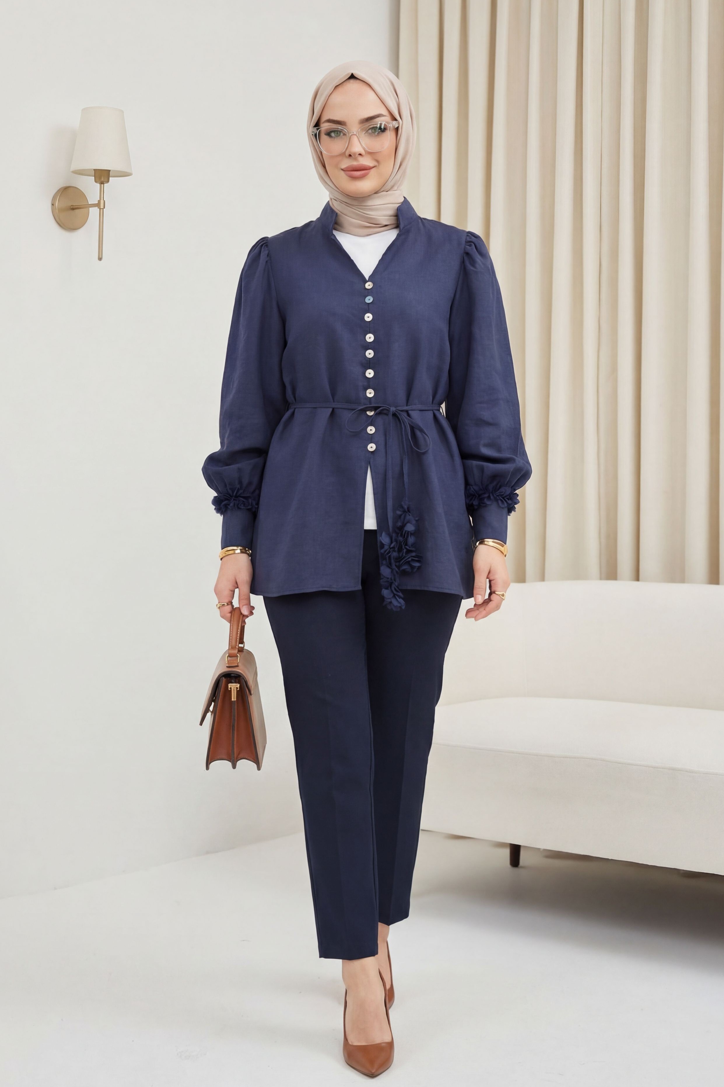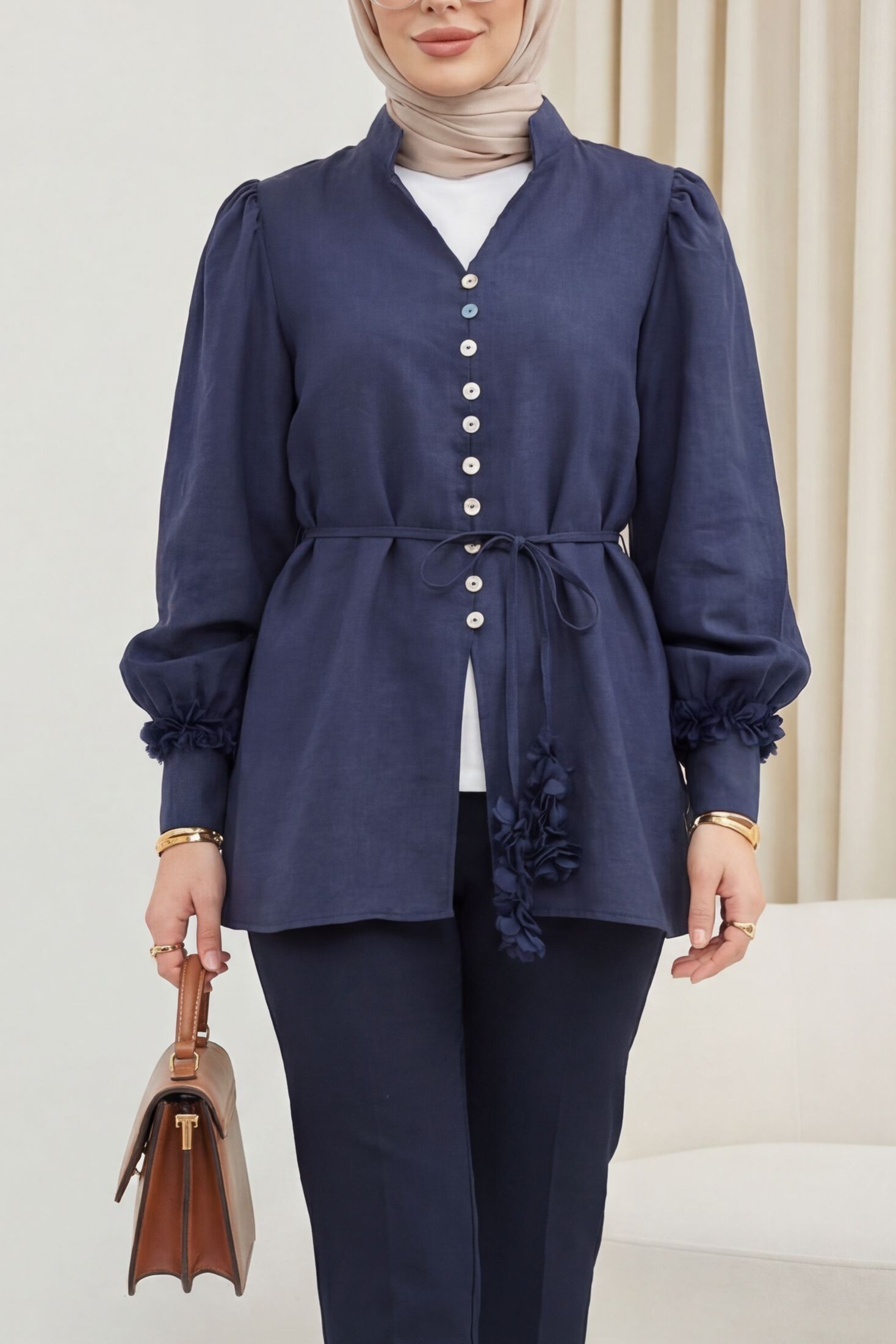 V Yaka Kolu Çiçekli Düğmeli Bağcıklı Modal Gömlek, zarif ve feminen bir stil sunar. V yaka ve düğmeli tasarımı sade bir şıklık sağlarken, kol kısmındaki çiçek detayları tasarıma romantik bir dokunuş katar. Bağcıklı formu silueti zarif şekilde vurgular. Modal kumaşı yumuşak ve nefes alabilendir.