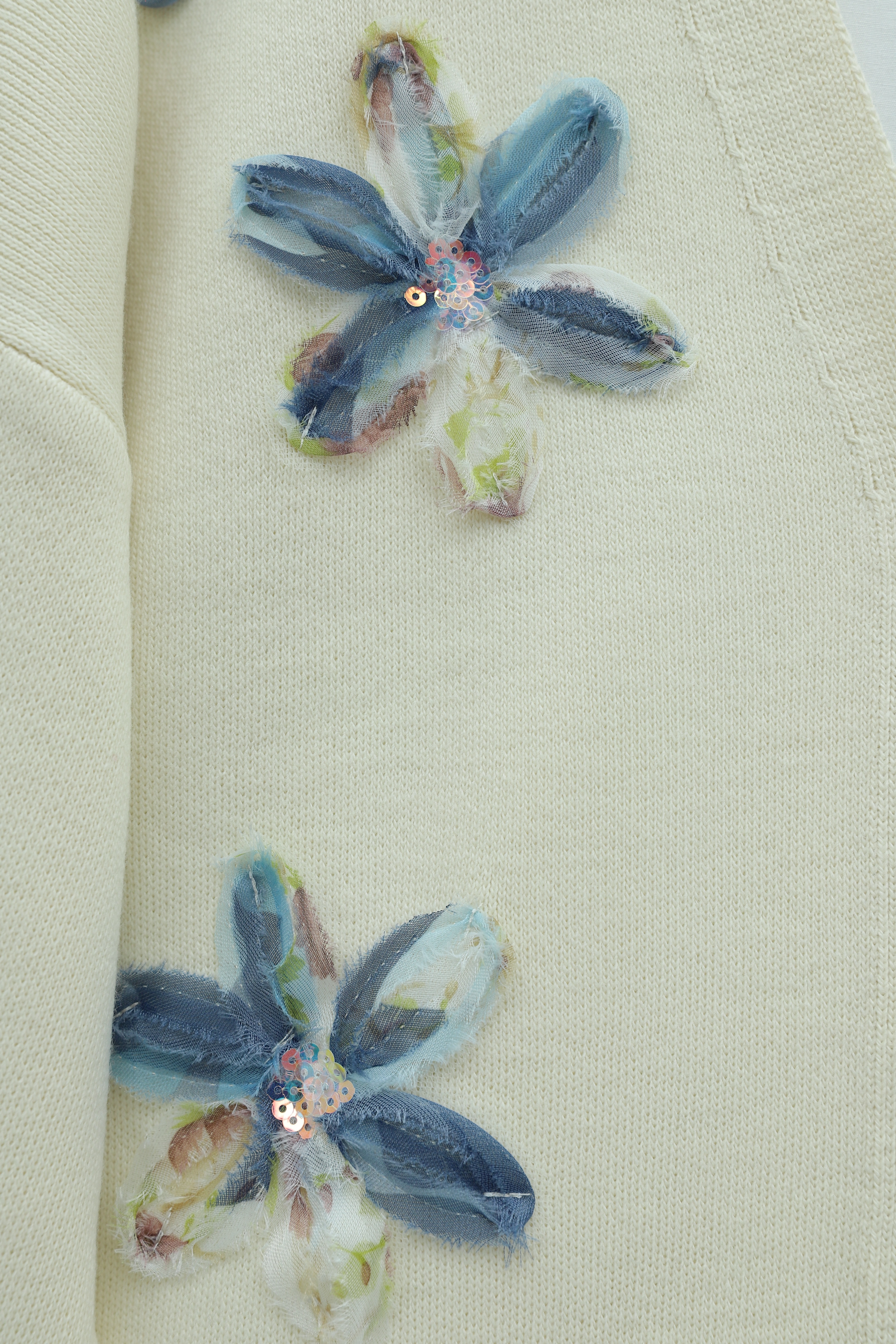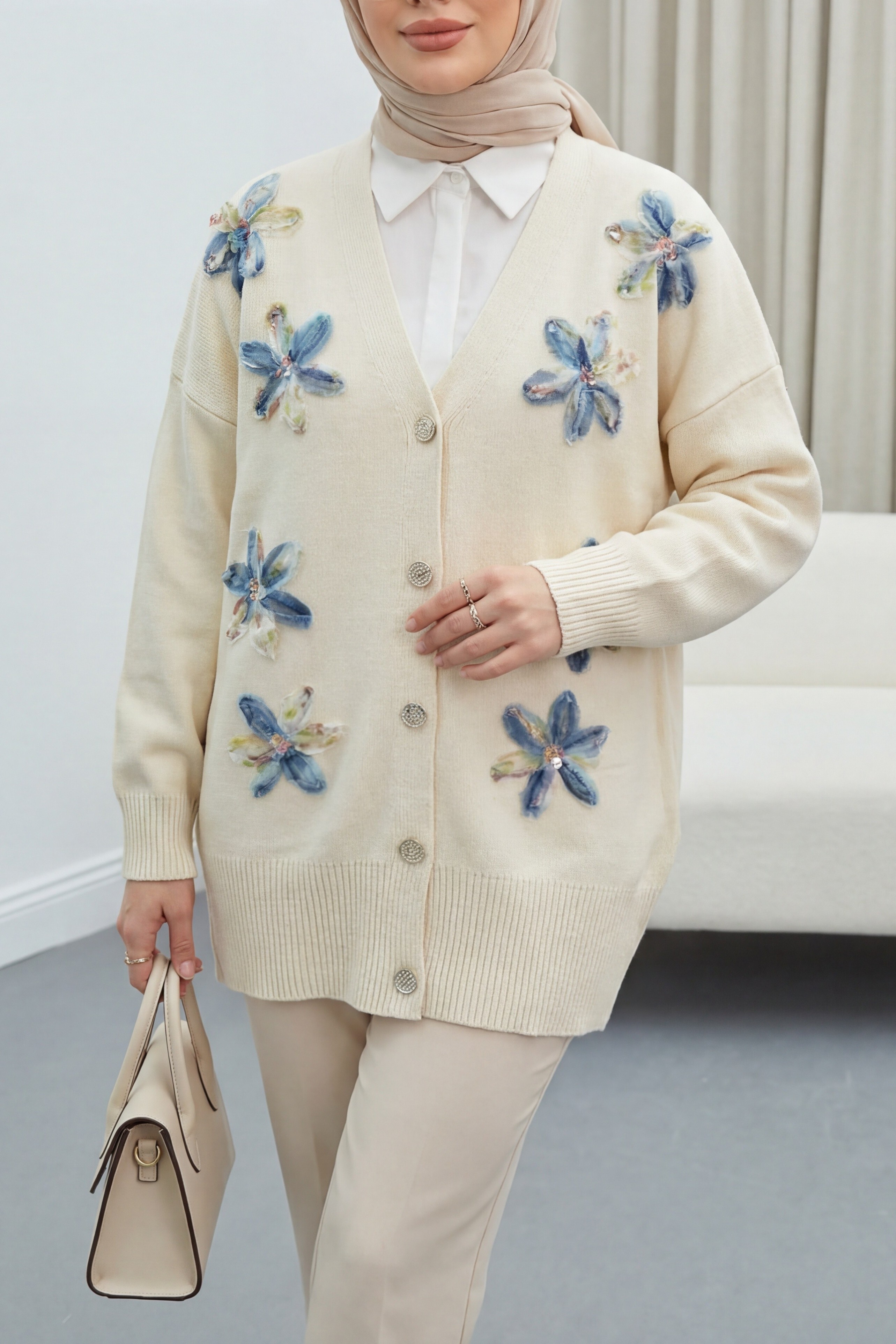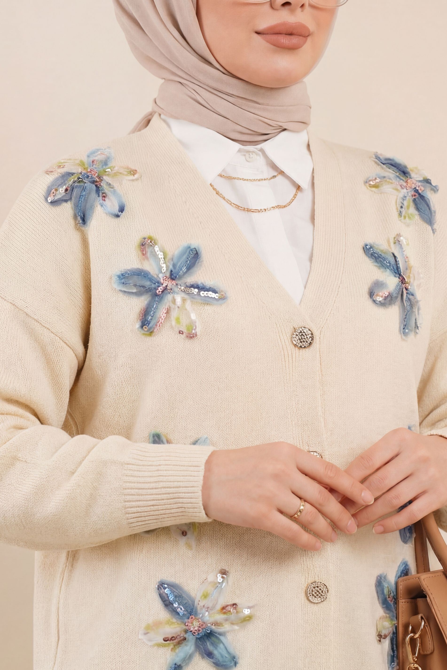 Zarif detayları ve şık tasarımıyla V Yaka Organze Tül Çiçek Nakışlı Triko Hırka, gardırobunuza sofistike bir dokunuş katıyor. V yaka kesimi ve organze tül üzerindeki çiçek nakışları, zarif bir görünüm sunarken, yumuşak triko kumaşı hem rahatlık hem şıklık sağlar. Hem günlük kullanımda hem de özel anlarda rahatça tercih edebilirsiniz.