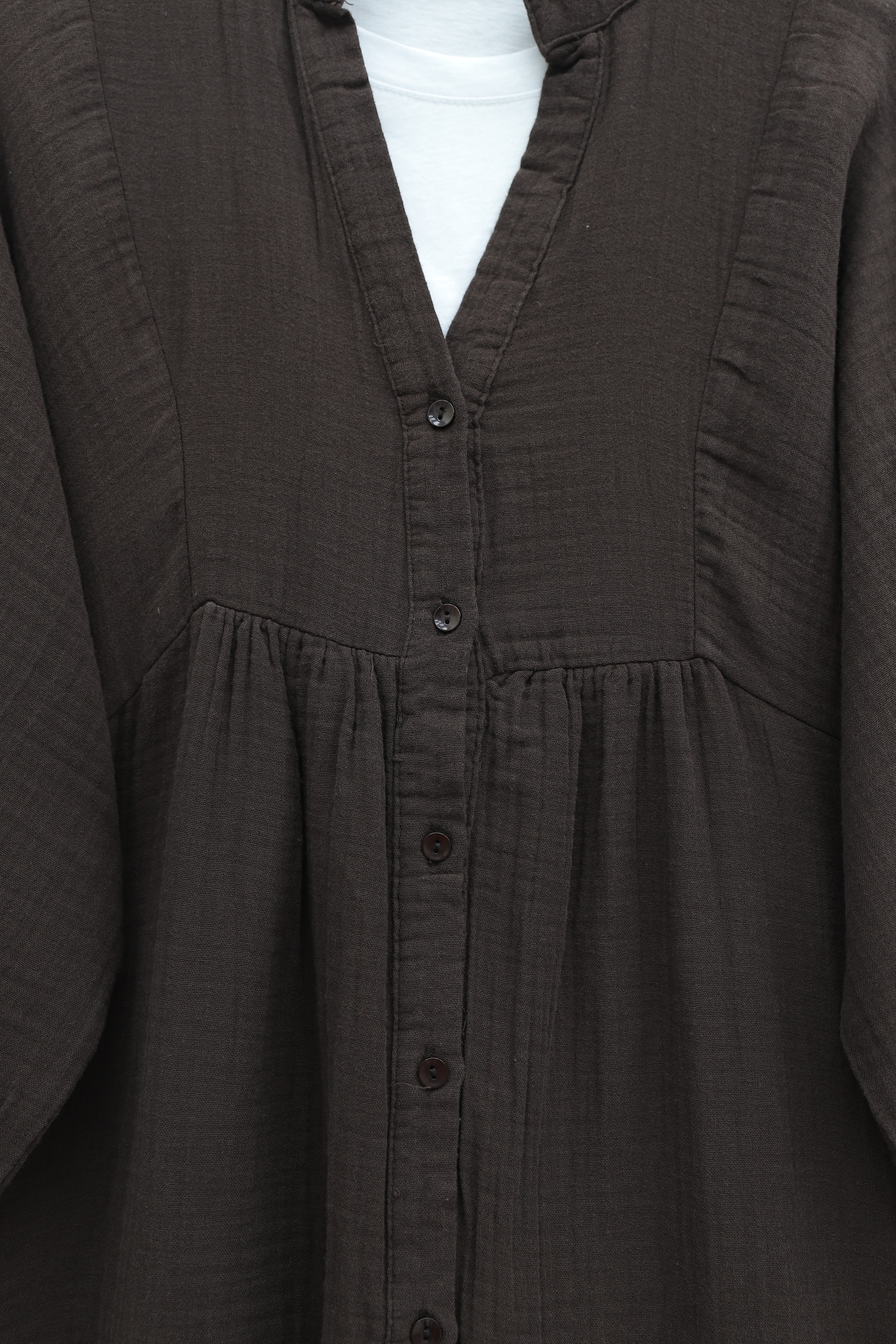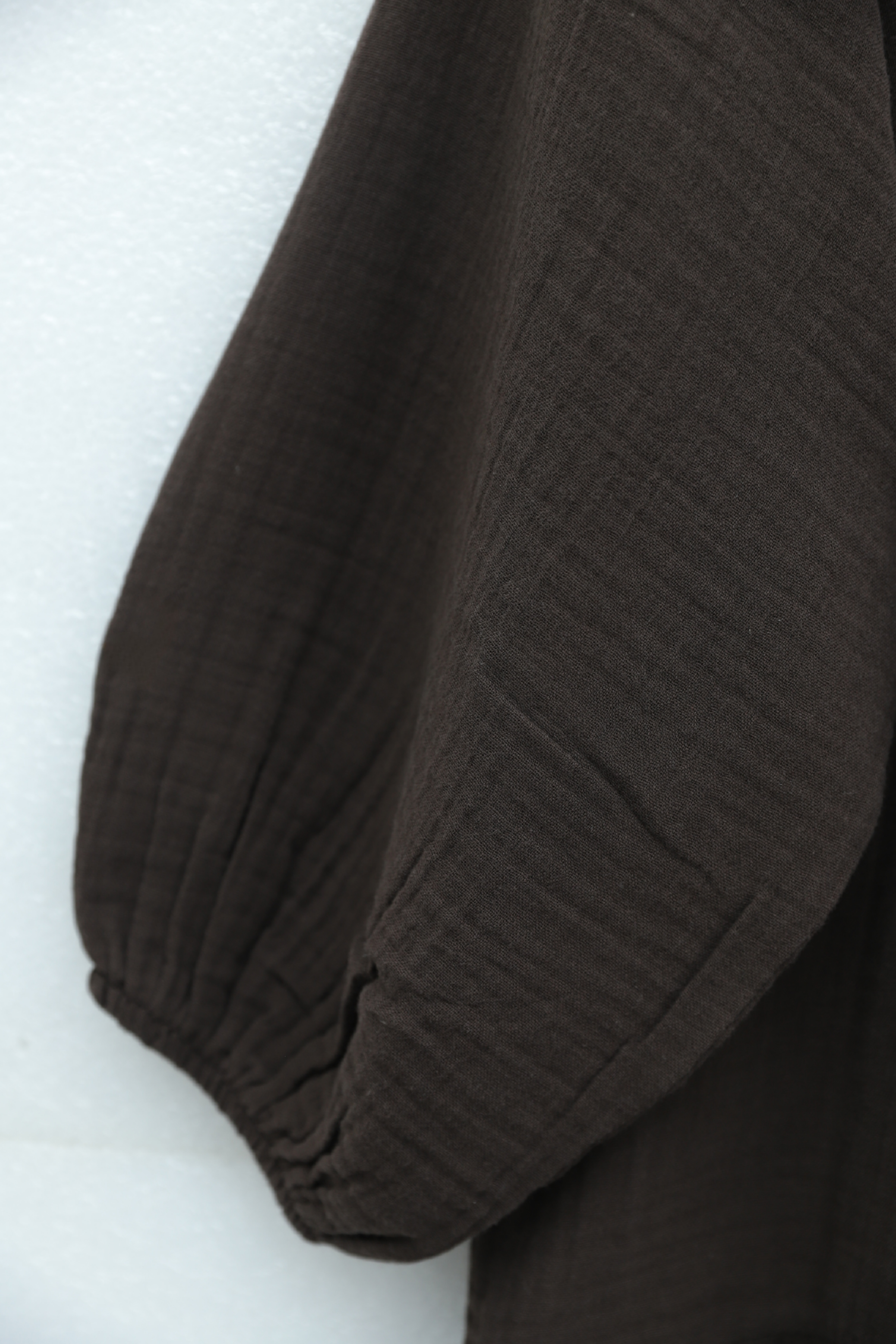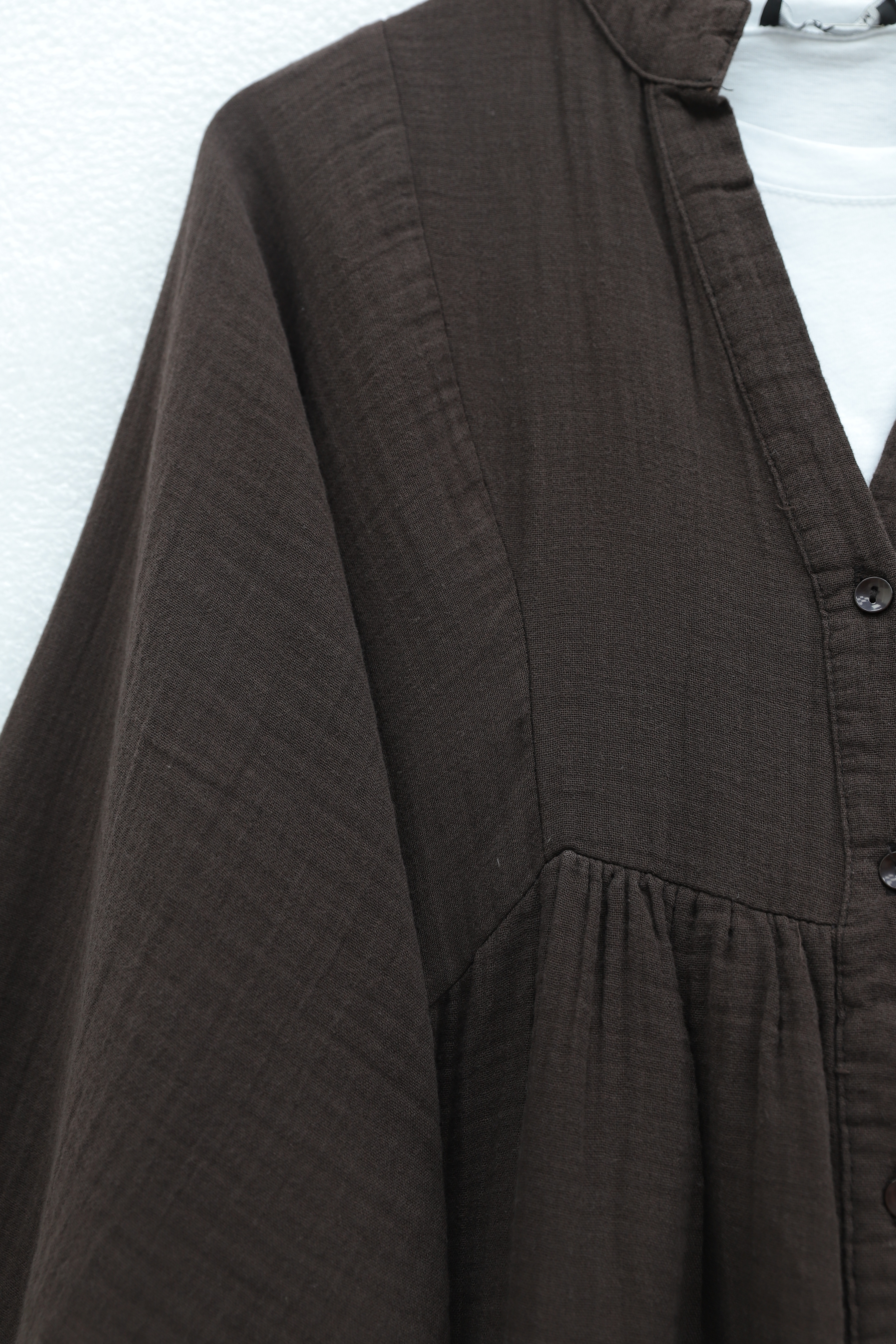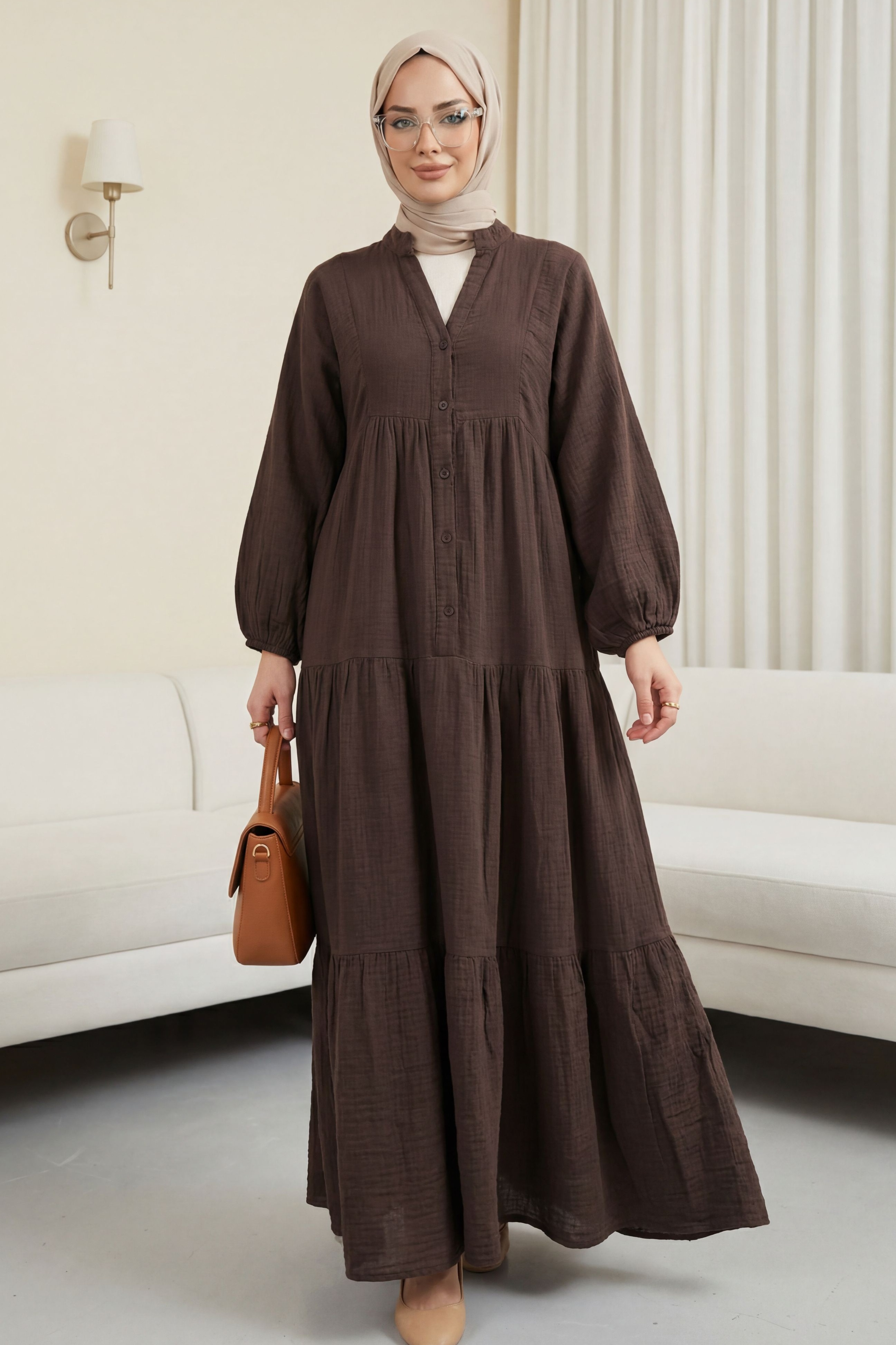 Doğal dokusu ve rahat kesimiyle öne çıkan V Yaka Yarım Düğmeli Kolu Lastikli Parçalı Müslin Elbise, gün boyu konforu şıklıkla buluşturur. V yaka tasarımı zarif bir görünüm sunarken, yarım düğmeli detayı elbiseye modern bir hava katar.