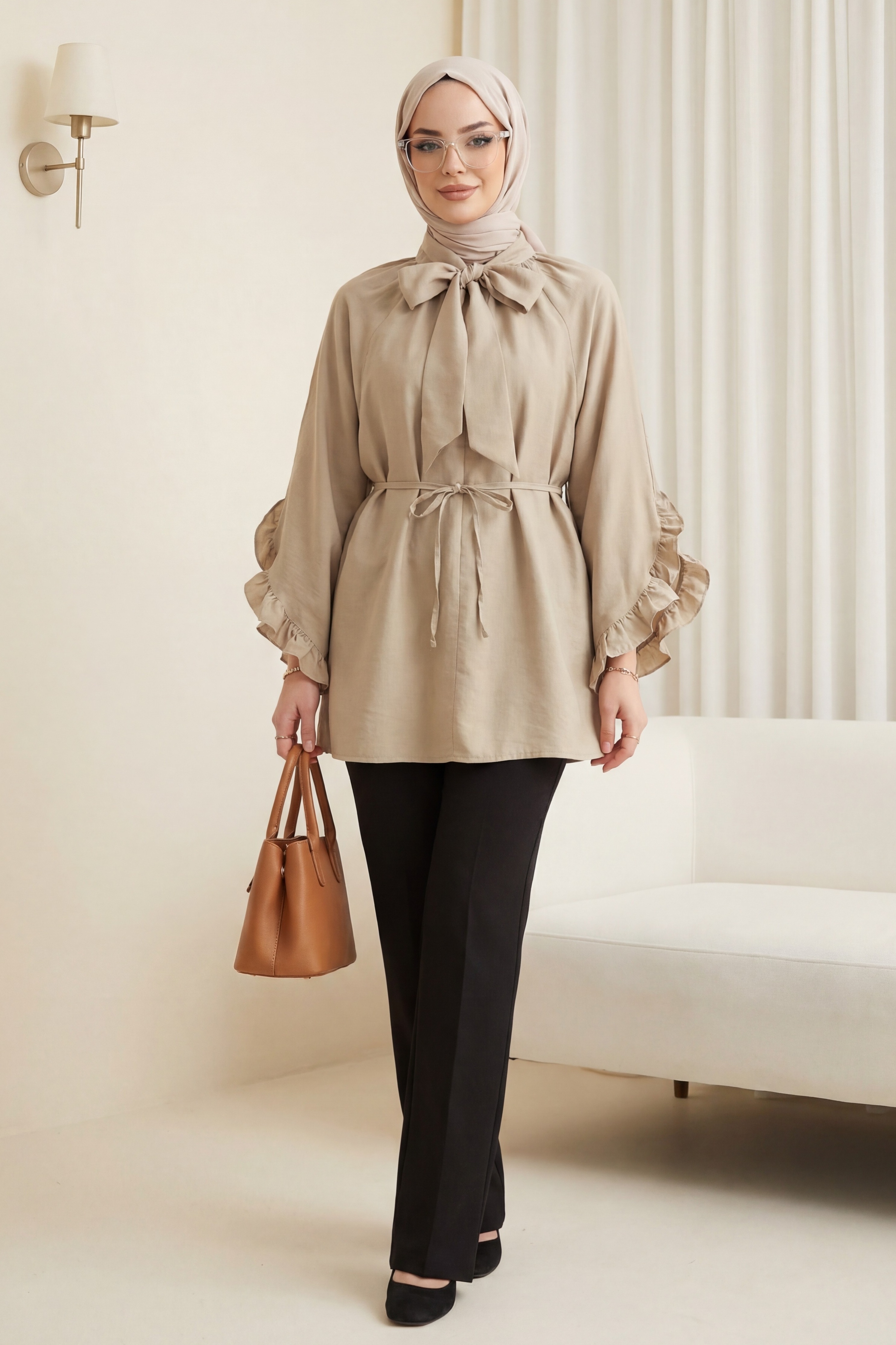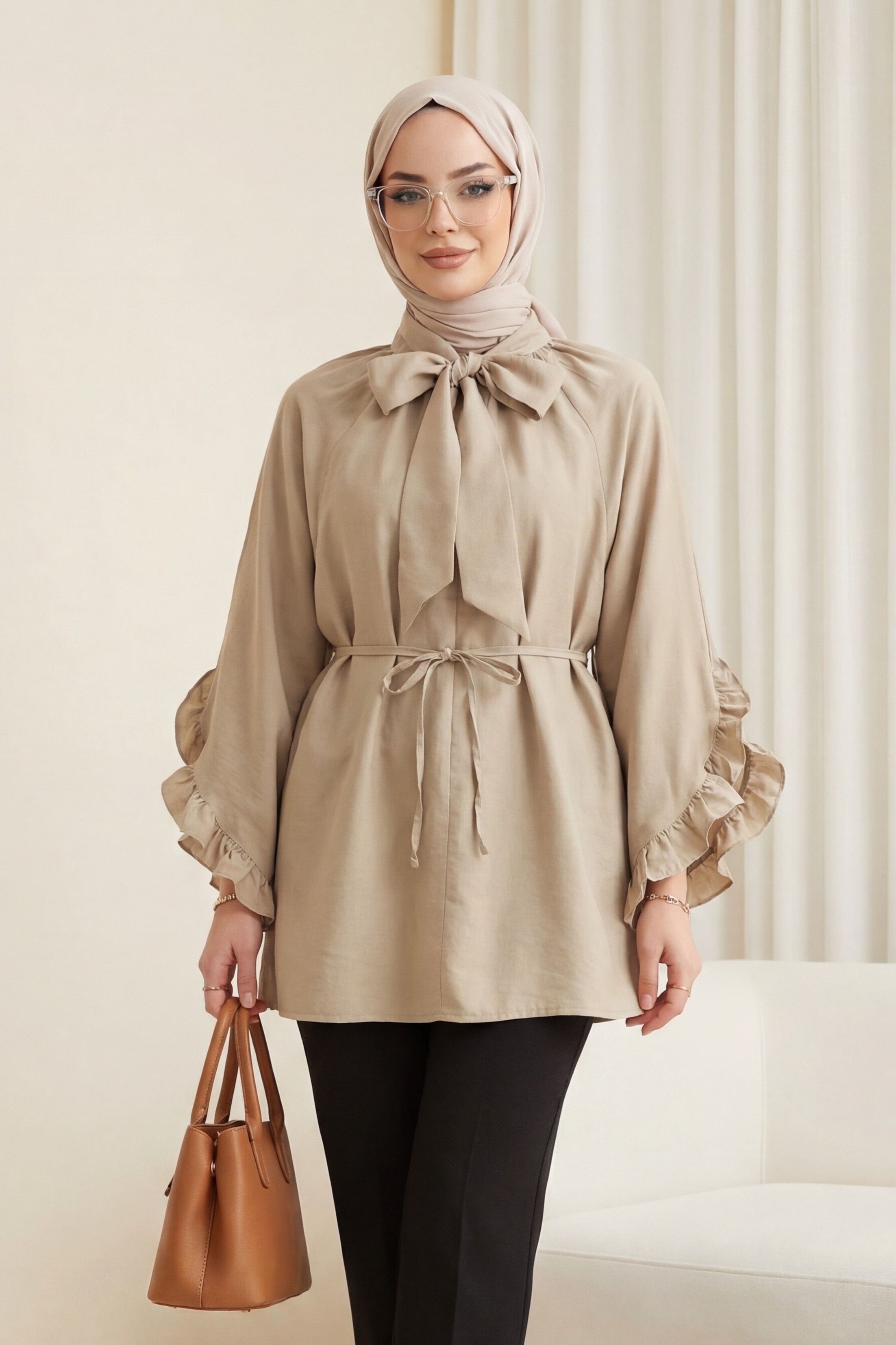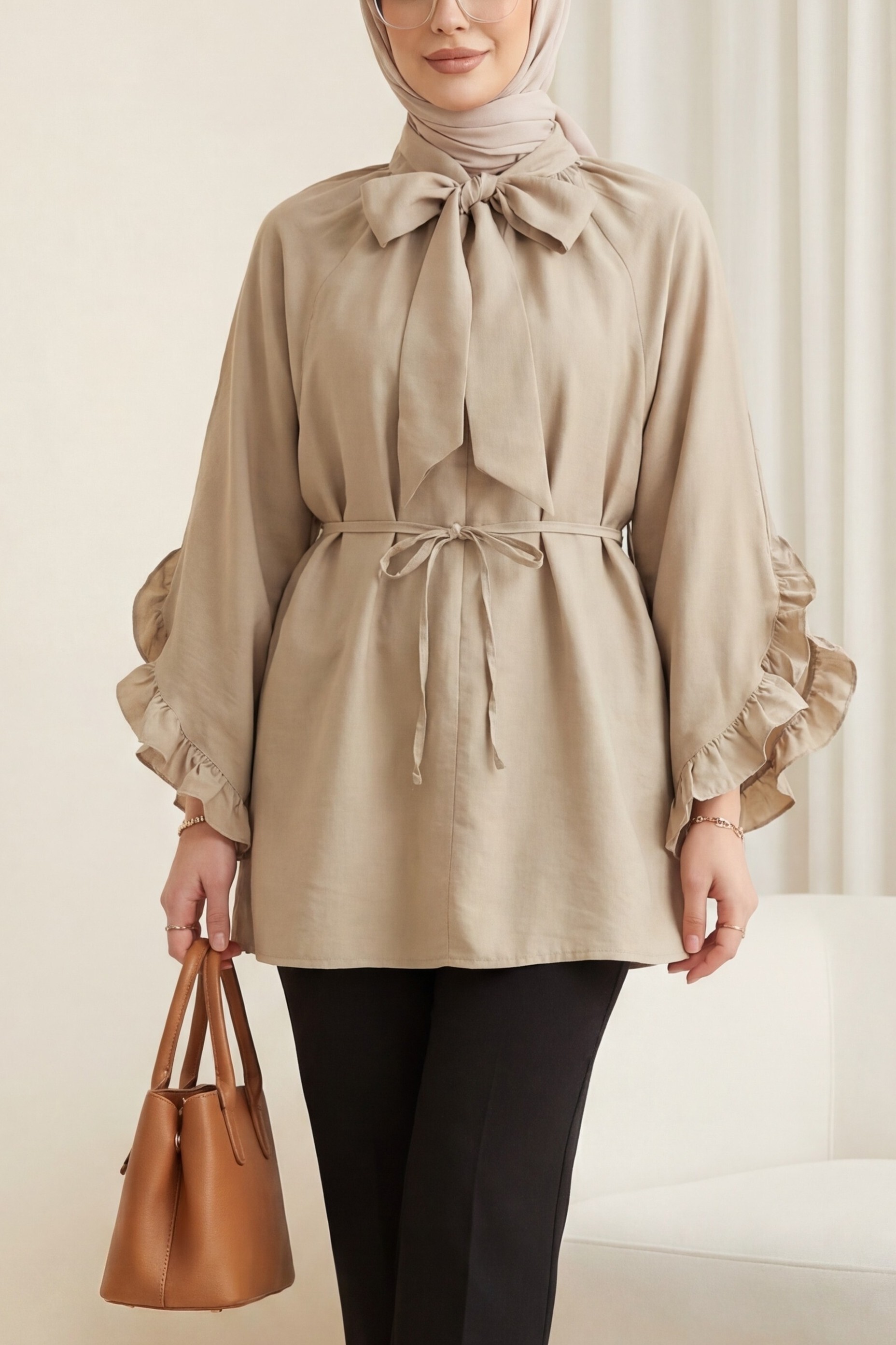 Yakası Bağcıklı Fermuarlı Kolu Fırfırlı Kemerli Modal Tunik -Bej