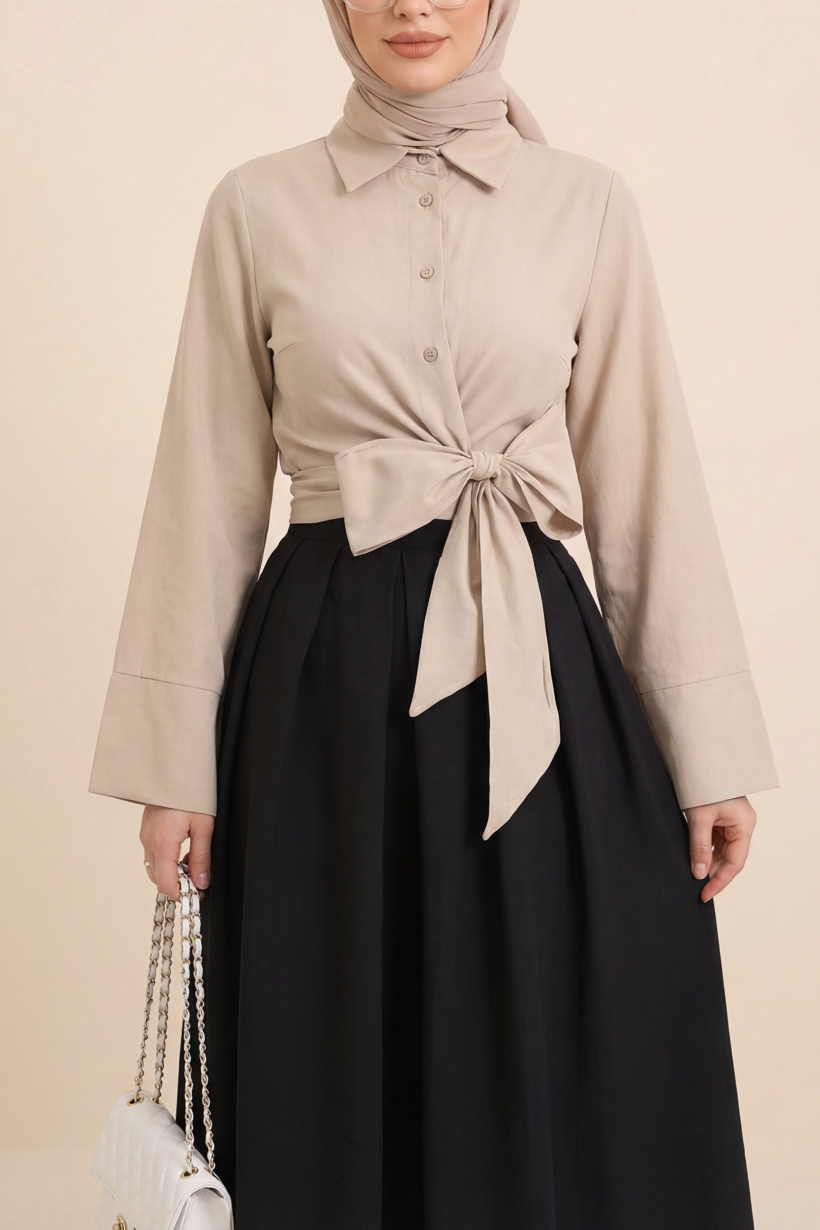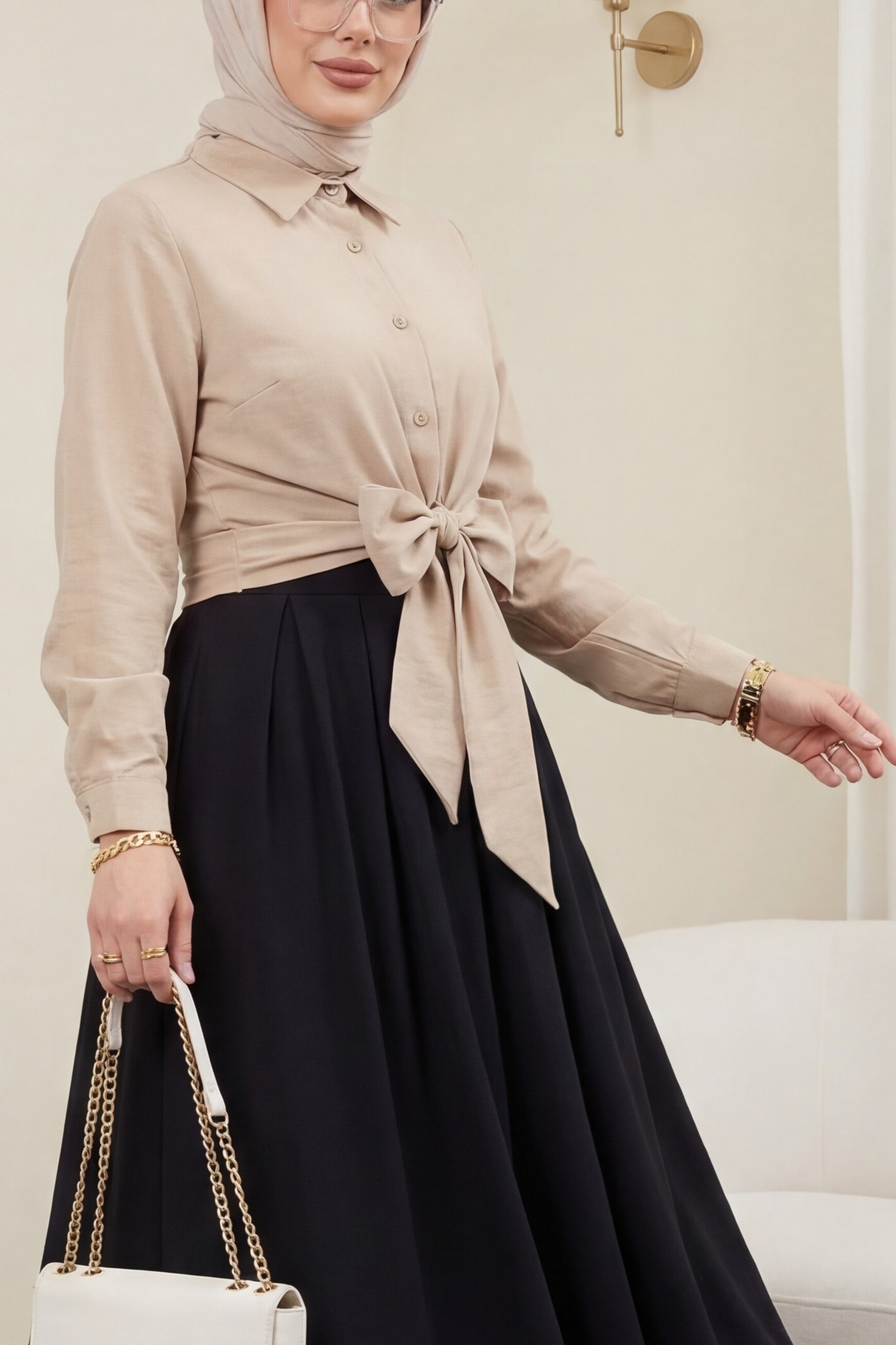 Yan Bağlamalı İspanyol Kol Düğmeli Gömlek -Açık Vizon
