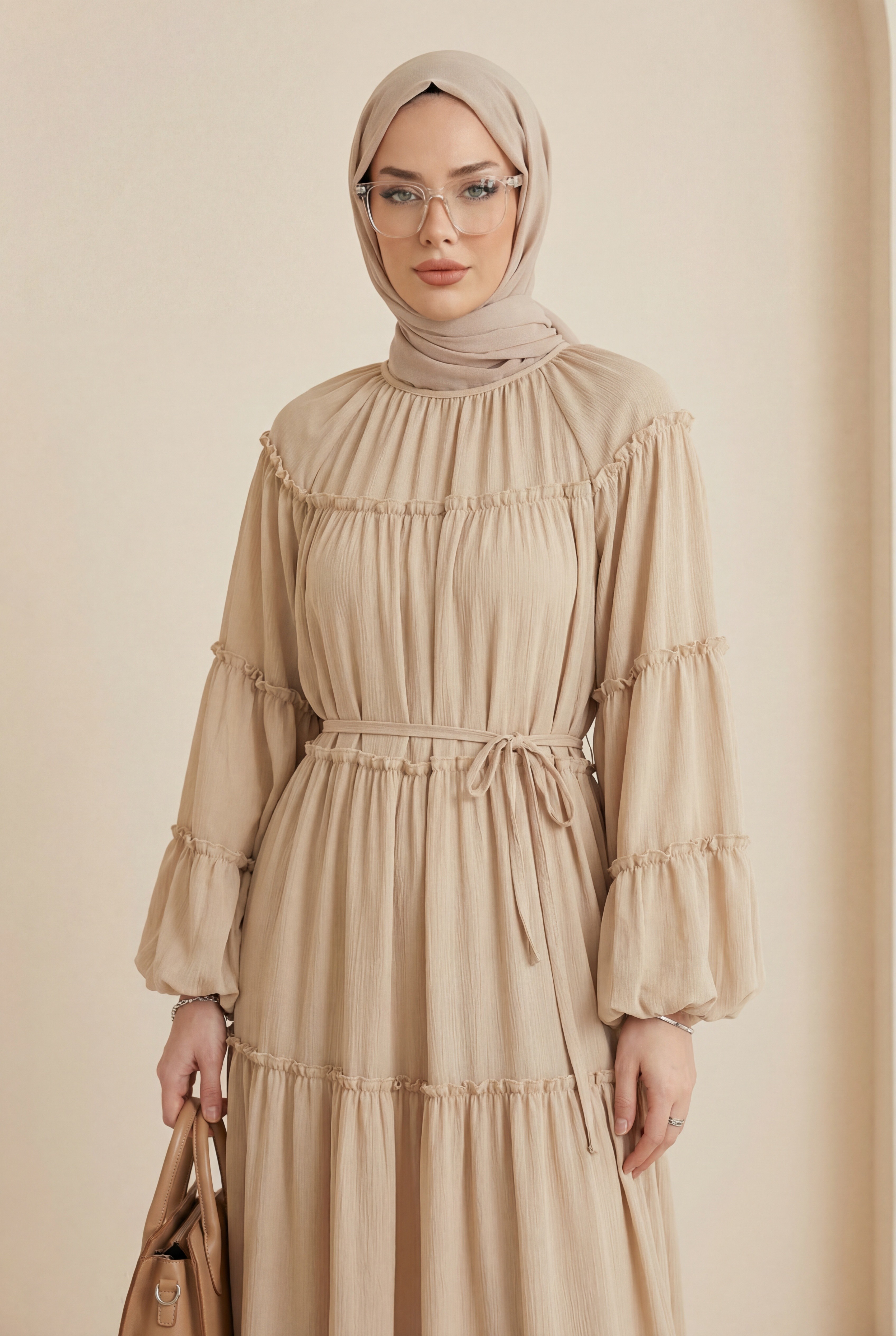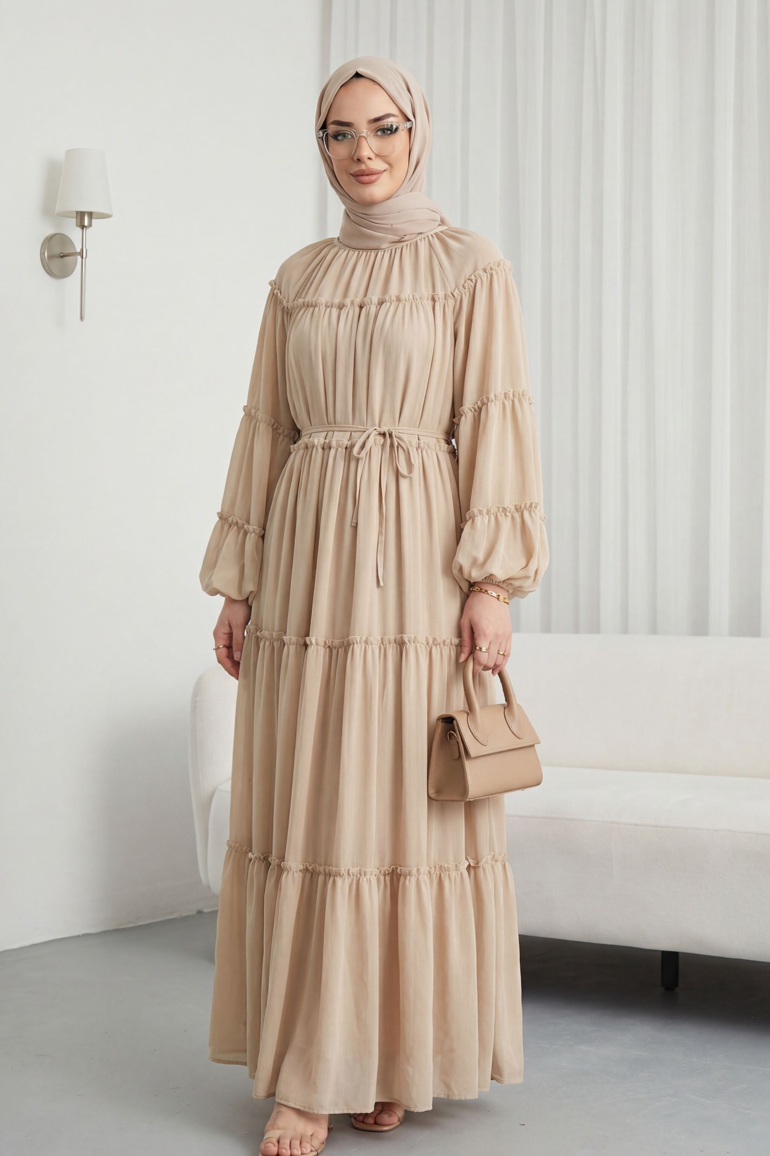 Yuvarlak Yaka Balon Kol Parçalı Astarlı Şifon Elbise, zarif ve akışkan bir stil sunar. Yuvarlak yaka ve balon kol detayı şık bir duruş kazandırırken, parçalı tasarımı hareketli bir siluet oluşturur. Astarlı yapısı konfor sağlar. Şifon kumaşı hafif ve uçuş uçuş bir görünüm sunar.