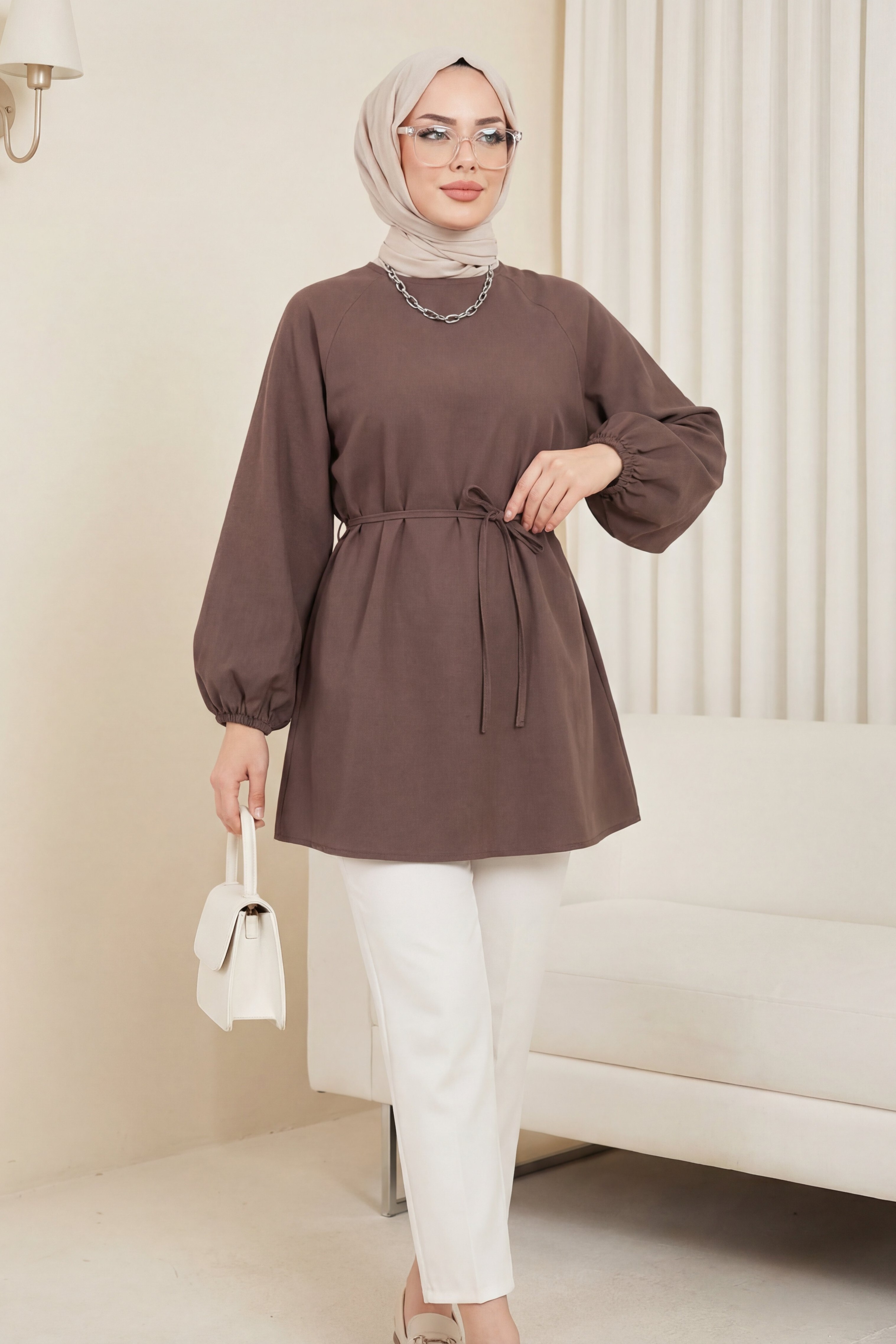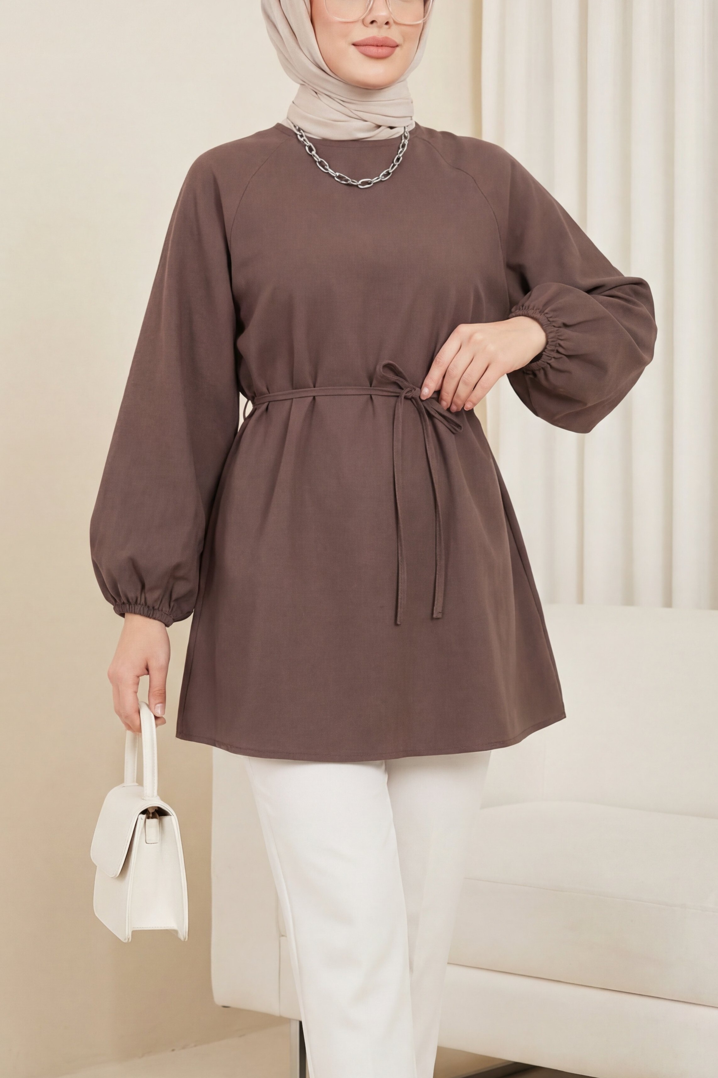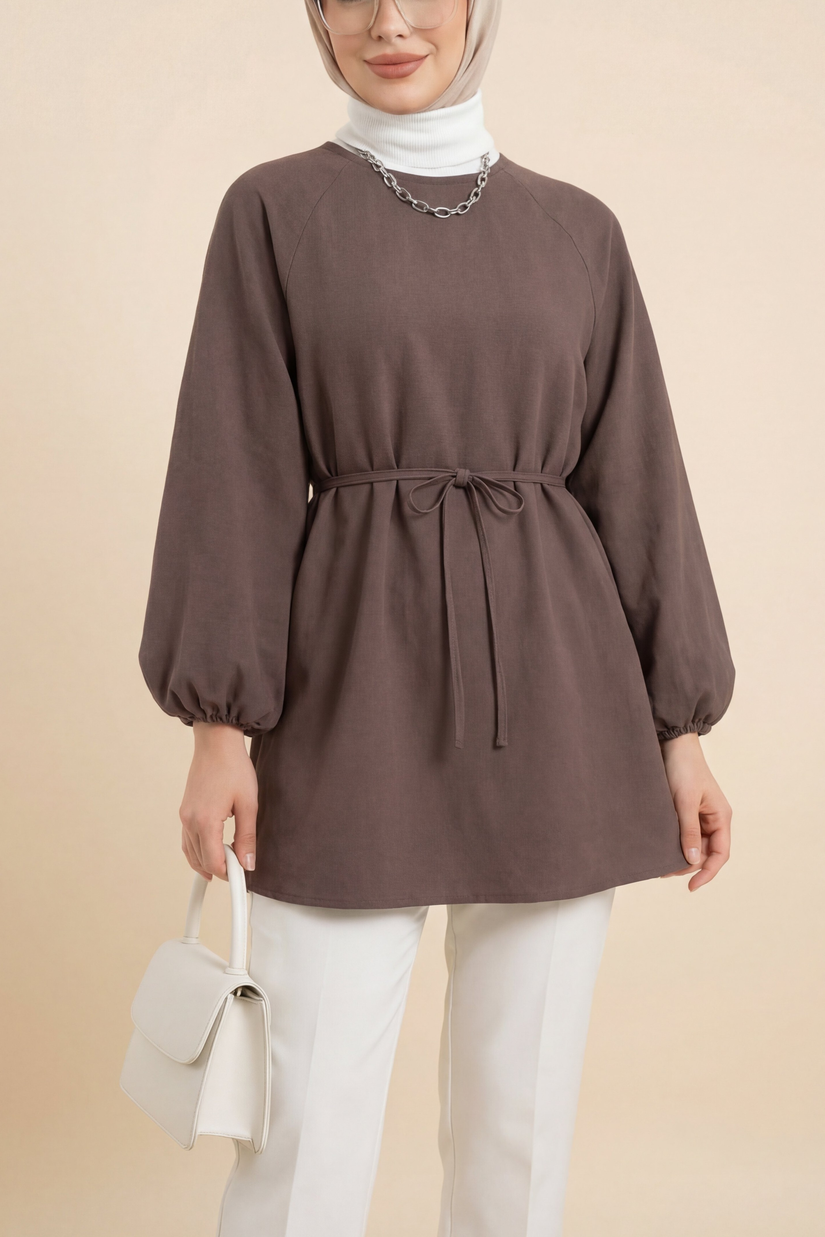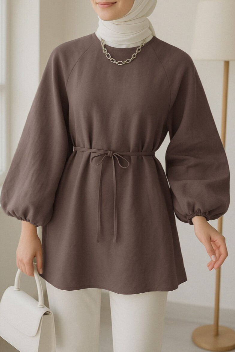 Yuvarlak yaka, beli bağcıklı, balon kol tunik; rahat ve şık bir tasarım sunar. Beli bağcıklı detayı vücuda otururken şıklığı artırırken, balon kollu tasarım tuniklere modern bir hava katar. Günlük kullanımda rahatlıkla tercih edebileceğiniz bu tunik, farklı kombinlerle zarif ve dinamik bir stil oluşturmanızı sağlar.