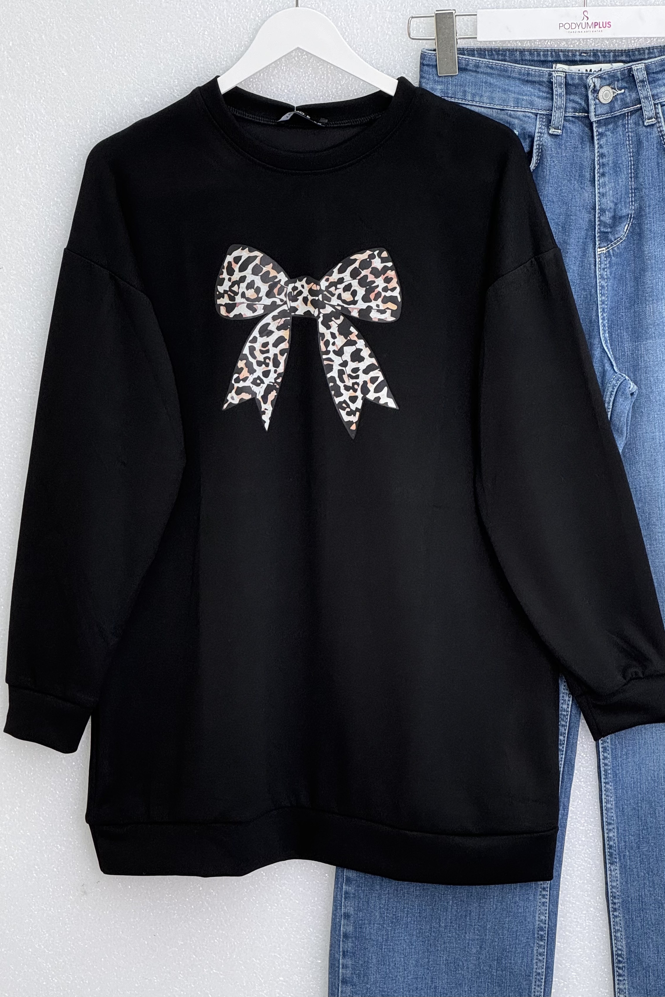 Yuvarlak Yaka Fiyonk Baskılı Salaş Oyşo Tunik -Siyah