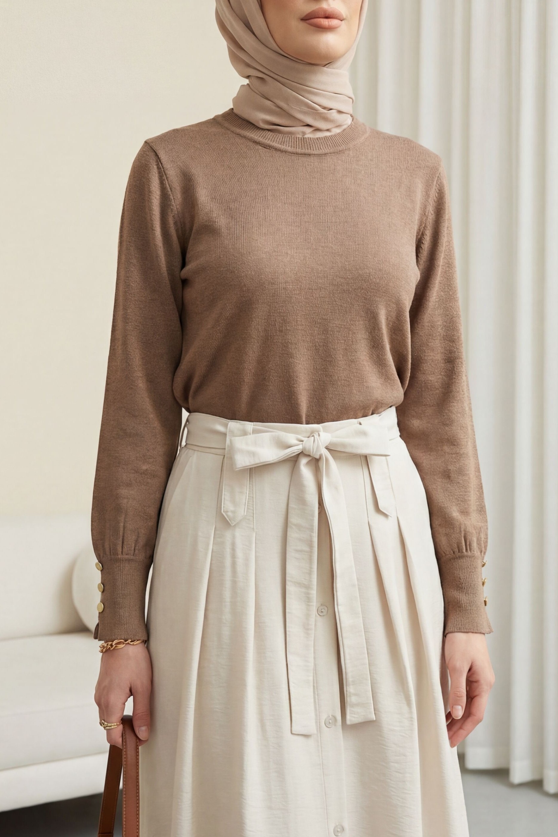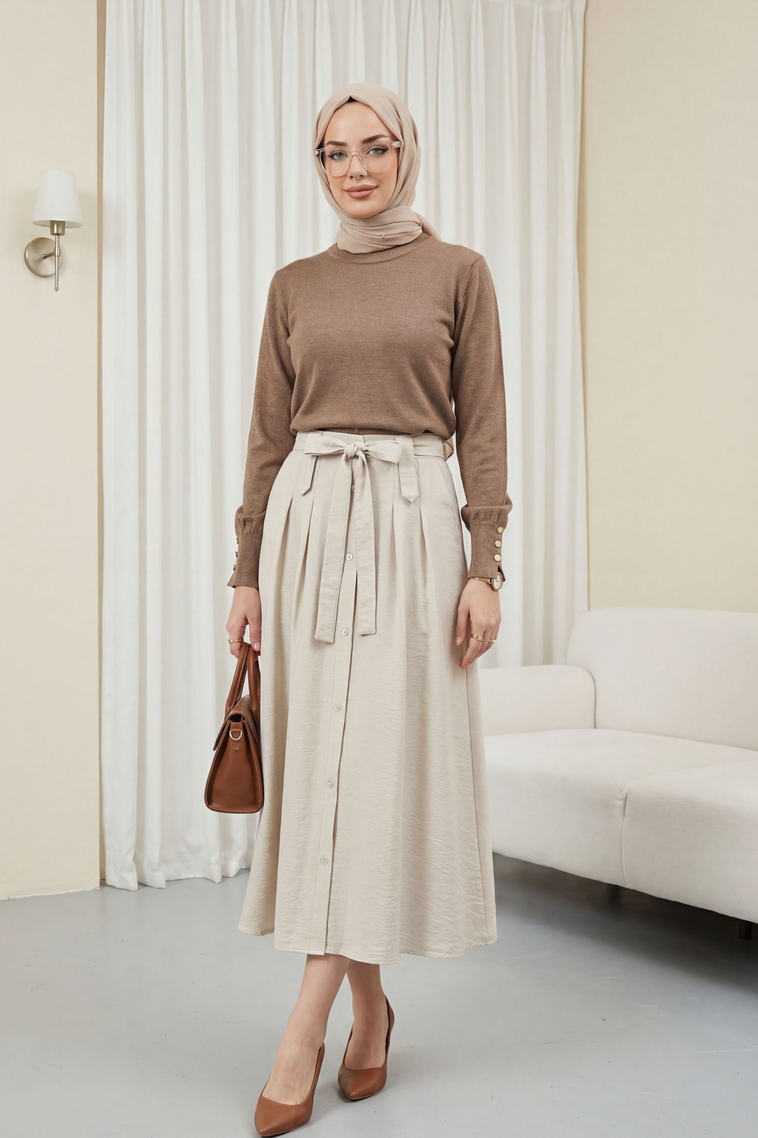 Yuvarlak Yaka Kolu Düğme Detaylı Triko Tunik, rahat ve şık bir stil sunar. Yuvarlak yaka tasarımı sade bir görünüm sağlarken, kol düğme detayları tasarıma zarif bir dokunuş katar. Triko kumaşı yumuşak ve konforludur. Günlük kombinlerde kolayca tercih edilir. Vücuda oturan fakat sıkmayan ideal kalıbı ile dengeli bir duruş sağlar.